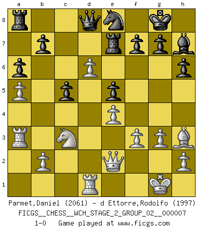 Last move : 1-0 2010 October 17 5:22:10 [Event "FICGS__CHESS__WCH_STAGE_2_GROUP_02__000007"] [Site "FICGS"] [Date "2010.07.06"] [Round "1"] [White "Parmet,Daniel"] [Black "d Ettorre,Rodolfo"] [Result "1-0"] [WhiteElo "2061"] [BlackElo "1997"] 1.d4 Nf6 2.c4 d6 3.Nc3 Bf5 4.g3 e5 5.Bg2 c6 6.Nf3 Nbd7 7.O-O h6 8.Re1 Be7 9.e4 Bh7 10.Nh4 Qb6 11.d5 cxd5 12.cxd5 O-O 13.Qe2 Qb4 14.Bh3 Nc5 15.Nf5 Rfe8 16.a3 Qb3 17.Nxe7+ Rxe7 18.f3 a6 19.Be3 Nfd7 20.a4 Qb6 21.Ra3 Nf6 22.a5 Qd8 23.Bxc5 dxc5 24.Rd1 Ne8 25.d6 1-0 Old Indian : Janowski variation Kingside Castling by player White (move 7) Kingside Castling by player Black (move 12) Player White won this chess game. Follow this game move after move (download)I play correspondence chess because it is both art and science while chess is art only. (A player at FICGS) Es hat in meinem Leben Zeiten gegeben, da ich sehr nahe daran war zu glauben, daß ich auch nicht eine einzige Schachpartie verlieren könnte. (José Raúl Capablanca) El jugador de combinación piensa hacia adelante; comienza de la posición dada y trabaja las movidas contundentes en su mente. (Emanuel Lasker) Même si l'adversaire joue le coup analysé précédemment, recommencez l'analyse en voyant la nouvelle position. Première règle de Blumenfeld The beginning of wisdom is silence. The second step is listening. (Unknown)