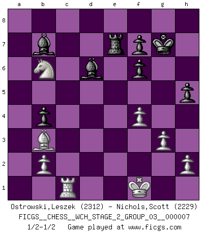Last move : 1/2-1/2 2010 August 4 2:53:54 [Event "FICGS__CHESS__WCH_STAGE_2_GROUP_03__000007"] [Site "FICGS"] [Date "2010.07.06"] [Round "1"] [White "Ostrowski,Leszek"] [Black "Nichols,Scott"] [Result "1/2-1/2"] [WhiteElo "2312"] [BlackElo "2229"] 1.d4 d5 2.Nf3 Nf6 3.c4 c6 4.e3 e6 5.Nc3 Nbd7 6.Qc2 Bd6 7.Bd3 dxc4 8.Bxc4 O-O 9.O-O b5 10.Be2 Bb7 11.e4 e5 12.Rd1 Qc7 13.Bg5 exd4 14.Rxd4 Ne5 15.Bxf6 gxf6 16.g3 b4 17.Na4 c5 18.R4d1 Rfe8 19.Rac1 Rac8 20.a3 a5 21.Nd2 c4 22.axb4 axb4 23.Nxc4 Nxc4 24.Bxc4 Rxe4 25.Bd3 Qxc2 26.Bxc2 Re6 27.Bb3 Rxc1 28.Rxc1 Re5 29.Kf1 Kg7 30.f4 Re7 31.Nb6 h5 1/2-1/2 Queen's pawn game Kingside Castling by player Black (move 8) Kingside Castling by player White (move 9) This chess game ended in a draw. Follow this game move after move (download)Chess books should be used as we use glasses: to assist the sight, although some players make use of them as if they thought they conferred sight. (Jose Raul Capablanca) Wie bekannt hörte Morphy 1859 auf, Schach zu spielen. Seine Enttäuschung galt nicht so sehr dem Schach, wie den Schachspielern. (Robert James Fischer) Siempre es mucho mejor sacrificar las piezas de tu oponente. (Savielly Tartakover) La vérité est comme le meilleur coup aux échecs : elle existe, mais il faut la chercher. (Arturo Perez-Reverte) If you know the enemy and know yourself you need not fear the results of a hundred battles. (Sun Tzu)