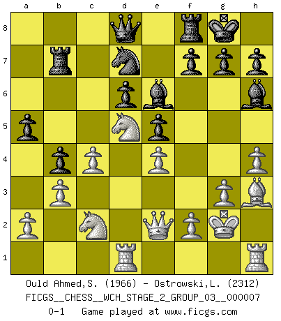 Last move : 0-1 2010 September 12 20:42:10 [Event "FICGS__CHESS__WCH_STAGE_2_GROUP_03__000007"] [Site "FICGS"] [Date "2010.07.06"] [Round "1"] [White "Ould Ahmed,Samy"] [Black "Ostrowski,Leszek"] [Result "0-1"] [WhiteElo "1966"] [BlackElo "2312"] 1.e4 c5 2.Nf3 e6 3.d4 cxd4 4.Nxd4 Nc6 5.Nc3 Nf6 6.Ndb5 d6 7.Bf4 e5 8.Bg5 a6 9.Na3 b5 10.Nd5 Qa5+ 11.Bd2 Qd8 12.Bg5 Be7 13.Bxf6 Bxf6 14.c4 b4 15.Nc2 Rb8 16.b3 Bg5 17.g3 O-O 18.h4 Bh6 19.Bh3 Be6 20.Kf1 Rb7 21.Kg2 a5 22.Qe2 Nb8 23.Rad1 Nd7 0-1 This chess game has been lost on time (started : 2010.07.06 16:57:54) Sicilian : Taimanov variation Kingside Castling by player Black (move 17) Player Black won this chess game. Follow this game move after move (download)Chess is like war on a board. (Bobby Fischer) Es gibt nur zwei wahre Schachgenies - das andere war Wilhelm Steinitz, der Weltmeister von 1872 bis 1894. (Robert James Fischer) Bobby Fischer es el jugador de Ajedrez mas grande que jamás haya existido. (Ken Smith) Il n'y a pas eu de défaite parce que je ne crois pas que cet ordinateur ait jamais existé. IBM a triché en refusant d'imprimer les modes de recherche de la machine. C'est évident, pendant le match, des coups décisifs ont été joués par des êtres humains. Aujourd'hui, les meilleurs spécialistes en informatique ne peuvent toujours pas expliquer comment Deep-Blue a pu jouer contre la logique des ordinateurs. IBM a gagné une guerre de communication, mais ils sont incapables de prouver que l'ordinateur a gagné tout seul. (Garry Kasparov) There's no money in correspondence chess. (John Knudsen)