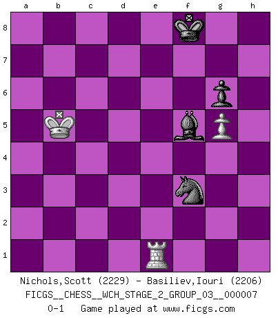Last move : 0-1 2010 September 7 18:33:49 [Event "FICGS__CHESS__WCH_STAGE_2_GROUP_03__000007"] [Site "FICGS"] [Date "2010.07.06"] [Round "1"] [White "Nichols,Scott"] [Black "Basiliev,Iouri"] [Result "0-1"] [WhiteElo "2229"] [BlackElo "2206"] 1.e4 c5 2.Nc3 Nc6 3.f4 g6 4.Nf3 Bg7 5.Bc4 e6 6.e5 d5 7.exd6 Qxd6 8.O-O Nge7 9.d3 O-O 10.Ne4 Qc7 11.c3 b6 12.Qe2 Bb7 13.Bd2 Rad8 14.Rae1 Na5 15.Bxe6 fxe6 16.Neg5 e5 17.Ne6 Qd6 18.Nxd8 Rxd8 19.fxe5 Qxd3 20.Qxd3 Rxd3 21.Bg5 Nac6 22.Rd1 Ba6 23.e6 Nd5 24.Rde1 Nc7 25.Bf4 Ne8 26.Rf2 Rd5 27.h4 h6 28.g4 Bc8 29.a3 Rd3 30.Kf1 Nd8 31.Ne5 Bxe5 32.Rxe5 Kg7 33.Ke2 Rd6 34.Re3 Rxe6 35.Rxe6 Bxe6 36.g5 hxg5 37.hxg5 Bb3 38.Ke3 Kg8 39.Rd2 Nc6 40.Rd7 Be6 41.Rd2 a5 42.b4 axb4 43.axb4 cxb4 44.cxb4 Nxb4 45.Bh2 Ng7 46.Rb2 Nf5+ 47.Kd2 Nd5 48.Kd3 Bd7 49.Ke4 Bc6 50.Ke5 Nde3 51.Rb4 Kf7 52.Bg1 b5 53.Bxe3 Nxe3 54.Kd6 Be8 55.Rf4+ Nf5+ 56.Kc7 Kf8 57.Rb4 Ne3 58.Kd6 Nc4+ 59.Kc5 Bd7 60.Rb1 Nd2 61.Re1 Bf5 62.Kxb5 Nf3 0-1 Sicilian : Grand Prix attack Kingside Castling by player White (move 8) Kingside Castling by player Black (move 9) 10 pieces endgame at move 44 : White KRBP , Black KBNNPP WHITE : King + 1 Rook 1 Bishop 1 Pawn BLACK : King + 1 Bishop 2 Knights 2 Pawns 9 pieces endgame at move 53 : White KRBP , Black KBNPP WHITE : King + 1 Rook 1 Bishop 1 Pawn BLACK : King + 1 Bishop 1 Knight 2 Pawns 8 pieces endgame at move 53 : White KRP , Black KBNPP WHITE : King + 1 Rook 1 Pawn BLACK : King + 1 Bishop 1 Knight 2 Pawns 7 pieces endgame at move 62 : White KRP , Black KBNP WHITE : King + 1 Rook 1 Pawn BLACK : King + 1 Bishop 1 Knight 1 Pawn Player Black won this chess game. Follow this game move after move (download)It is peculiar but a fact nevertheless, that gamblers in chess always have enthusiastic followers. (Botvinnik) Ich hatte meine größten Erfolge, als ich 47 Jahre alt war. Kasparow war noch nicht mal 42 und hat das Schach schon im Stich gelassen. (Viktor Kortschnoi) Un Peón pasado es un criminal, quién debe ser mantenido bajo candado y llave. Leves medidas, tales como vigilancia policiaca, no son suficientes. (Aaron Nimzovich) Mon pion favori sur ma case favorite ! Bronstein en parlant d'un coup de pion en h5 quand il avait les Noirs. Men should grow up. - Yeah. And dogs should stop licking themselves. It's not gonna happen. (Gregory House to Dr. Cameron, House M.D.)