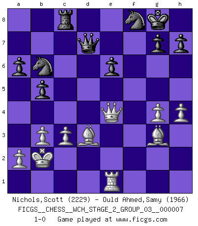 Last move : 1-0 2010 September 13 8:46:8 [Event "FICGS__CHESS__WCH_STAGE_2_GROUP_03__000007"] [Site "FICGS"] [Date "2010.07.06"] [Round "1"] [White "Nichols,Scott"] [Black "Ould Ahmed,Samy"] [Result "1-0"] [WhiteElo "2229"] [BlackElo "1966"] 1.e4 c5 2.Nc3 Nc6 3.Nf3 e6 4.d4 cxd4 5.Nxd4 d6 6.f4 Nf6 7.Be3 e5 8.Nf3 Be7 9.Qd2 O-O 10.O-O-O a6 11.Kb1 b5 12.Bd3 exf4 13.Bxf4 Be6 14.Nd5 Kh8 15.Rhf1 Rc8 16.Nxe7 Nxe7 17.Nd4 d5 18.exd5 Nexd5 19.Nxe6 fxe6 20.Bg3 Qe7 21.Rfe1 Rfd8 22.c3 Rc6 23.Ka1 Nb6 24.Qe2 Nc4 25.Qf3 R6c8 26.Bh4 Qf7 27.g4 Rd5 28.Bb1 Rxd1 29.Qxd1 Nd5 30.Qe2 Nf4 31.Qe4 Ng6 32.Bg3 Nf8 33.Bd3 Kg8 34.h4 Qd7 35.b3 Nb6 36.Kb2 1-0 This chess game has been lost on time (started : 2010.07.06 16:57:54) Sicilian : Closed, 2...Nc6 Kingside Castling by player Black (move 9) Queenside Castling by player White (move 10) Player White won this chess game. Follow this game move after move (download)A thorough understanding of the typical mating continuations makes the most complicated sacrificial combinations leading up to them not only not difficult, but almost a matter of course. (Siegbert Tarrasch) Zu meiner Zeit war ein 20 jähriger ein junger Spieler, heute ist er ein Veteran. (Garry Kasparov) El Ajedrez, como cualquier otra actividad creativa, puede existir solo a través de méritos combinados de aquellos que tienen talento creativo y de aquellos que tienen la habilidad de organizar un trabajo creativo. (Mikhail Botvinnik) Le thème de l'attaque double intervient d'une manière ou d'une autre dans l'immense majorité des combinaisons. (Youri Averbakh) Those parts of the system that you can hit with a hammer (not advised) are called hardware; those program instructions that you can only curse at are called software. (Anonymous)