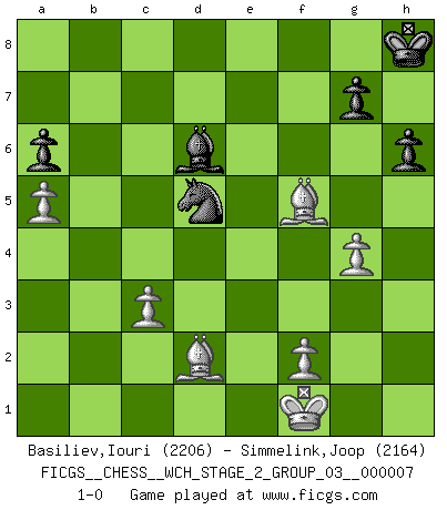 Last move : 1-0 2010 September 1 21:54:12 [Event "FICGS__CHESS__WCH_STAGE_2_GROUP_03__000007"] [Site "FICGS"] [Date "2010.07.06"] [Round "1"] [White "Basiliev,Iouri"] [Black "Simmelink,Joop"] [Result "1-0"] [WhiteElo "2206"] [BlackElo "2164"] 1.e4 e5 2.Nf3 Nc6 3.Bb5 a6 4.Ba4 Nf6 5.O-O Be7 6.Re1 b5 7.Bb3 O-O 8.h3 Bb7 9.d3 d5 10.exd5 Nxd5 11.Nxe5 Nxe5 12.Rxe5 Bf6 13.Re1 Re8 14.a4 b4 15.Nd2 Qd7 16.Ne4 Bd4 17.Rb1 Kh8 18.Bd2 f5 19.c3 Bb6 20.Ng5 Rxe1+ 21.Qxe1 Re8 22.Qf1 h6 23.Nf3 c5 24.Re1 Rxe1 25.Qxe1 Kh7 26.Qe2 bxc3 27.bxc3 Bc7 28.d4 Qd6 29.dxc5 Qxc5 30.Qe6 Nf6 31.Nd4 Bc8 32.Qf7 Be5 33.Ne6 Bxe6 34.Bxe6 Bd6 35.g4 fxg4 36.hxg4 Qe5 37.Bf5+ Kh8 38.Kf1 Qd5 39.Qxd5 Nxd5 40.a5 1-0 Ruy Lopez : Closed, 7...O-O Kingside Castling by player White (move 5) Kingside Castling by player Black (move 7) Player White won this chess game. Follow this game move after move (download)You know, comrade Pachman, I don't enjoy being a Minister, I would rather play Chess like you. (Che Guevara) Nach Morphy wurde nichts neues mehr in der Behandlung offener Positionen gefunden. (Mikhail Moiseyevich Botvinik) Las combinaciones han sido siempre el aspecto más intrigante del Ajedrez. Los Maestros las buscan, el público las aplauden, los críticos las alaban. La razón se debe a que las combinaciones hacen posible que el Ajedrez sea más que un ejercicio matemático con una carencia de vida. Ellas son la poesía del juego, son del Ajedrez lo que la melodía es de la música. Ellas representan el triunfo de la mente sobre la materia. (Reuben Fine) La solitude du joueur d'Echecs à l'approche du mat est semblable à celle du condamné. (Francis Szpiner) The meaning of life is that it is to be lived, and it is not to be traded and conceptualized and squeezed into a pattern of systems. (Bruce Lee)