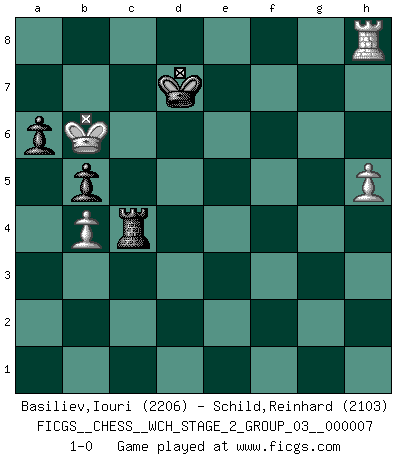Last move : 1-0 2010 December 15 6:51:38 [Event "FICGS__CHESS__WCH_STAGE_2_GROUP_03__000007"] [Site "FICGS"] [Date "2010.07.06"] [Round "1"] [White "Basiliev,Iouri"] [Black "Schild,Reinhard"] [Result "1-0"] [WhiteElo "2206"] [BlackElo "2103"] 1.e4 e5 2.Nf3 Nc6 3.Bb5 Nf6 4.O-O Bc5 5.Nxe5 Nxe5 6.d4 a6 7.Ba4 b5 8.Bb3 Bxd4 9.Qxd4 d6 10.f4 Nc6 11.Qc3 Bb7 12.e5 Ne4 13.Qe1 Nd4 14.Nd2 Nc5 15.c3 Ncxb3 16.exd6 Kf8 17.Nxb3 Nc2 18.Qe7+ Qxe7 19.dxe7+ Kxe7 20.Rb1 Rhe8 21.Rf2 Be4 22.Bd2 Kd6 23.Rc1 c5 24.f5 c4 25.Bf4+ Kc6 26.Nd2 Bd3 27.f6 g6 28.Nf3 Ne3 29.h3 Nd5 30.Ne5+ Kb6 31.Bg3 Re6 32.Nxf7 Rxf6 33.Ne5 Rxf2 34.Bxf2+ Kb7 35.Nxd3 cxd3 36.Rd1 Nf4 37.Be3 Ne2+ 38.Kf2 Rf8+ 39.Ke1 Ng3 40.Kd2 Nf1+ 41.Kxd3 Nxe3 42.Kxe3 Kc6 43.Rd4 Rf1 44.Rh4 Rb1 45.b4 Rb2 46.g4 h5 47.gxh5 gxh5 48.Rxh5 Rxa2 49.h4 Kd6 50.Rh6+ Kd5 51.Rg6 Rh2 52.Rg5+ Ke6 53.Kd4 Kd6 54.Rg6+ Kc7 55.Rh6 Rh3 56.h5 Kd7 57.Kc5 Rxc3+ 58.Kb6 Rc4 59.Rh8 1-0 Ruy Lopez : Berlin defense, Beverwijk variation Kingside Castling by player White (move 4) 10 pieces endgame at move 48 : White KRPPPP , Black KRPP WHITE : King + 1 Rook 4 Pawns BLACK : King + 1 Rook 2 Pawns 9 pieces endgame at move 48 : White KRPPP , Black KRPP WHITE : King + 1 Rook 3 Pawns BLACK : King + 1 Rook 2 Pawns 8 pieces endgame at move 57 : White KRPP , Black KRPP WHITE : King + 1 Rook 2 Pawns BLACK : King + 1 Rook 2 Pawns Player White won this chess game. Follow this game move after move (download)An attack on the wing should be met by play in the center. (Nimzovitch) Frage: Wie viele Autos haben Sie schon zerstört? - Antwort: Nur zwei. (Loek van Wely) El Rey es una pieza de pelea. ¡Usenlo!. (Wilhelm Steinitz) Les Echecs sont et restent toujours un combat, un combat intégral comme la boxe, la lutte ou un autre sport, et où il doit y avoir un vainqueur et un vaincu. (Joseph Emil Diemer) The modern world has divided itself into Conservatives and Progressives. The business of Progressives is to go on making mistakes. The business of the Conservatives is to prevent the mistakes from being corrected. (G.K. Chesterton)