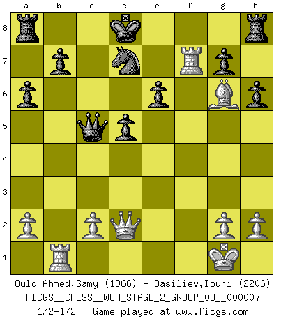 Last move : 1/2-1/2 2010 September 8 22:47:19 [Event "FICGS__CHESS__WCH_STAGE_2_GROUP_03__000007"] [Site "FICGS"] [Date "2010.07.06"] [Round "1"] [White "Ould Ahmed,Samy"] [Black "Basiliev,Iouri"] [Result "1/2-1/2"] [WhiteElo "1966"] [BlackElo "2206"] 1.e4 c5 2.Nf3 d6 3.d4 cxd4 4.Nxd4 Nf6 5.Nc3 a6 6.Bg5 e6 7.f4 Qb6 8.Qd2 Qxb2 9.Rb1 Qa3 10.e5 dxe5 11.fxe5 h6 12.Bh4 Nd5 13.Nxd5 exd5 14.e6 Bxe6 15.Nxe6 fxe6 16.Bd3 Be7 17.Bg6+ Kd8 18.Bxe7+ Qxe7 19.O-O Nd7 20.Rf7 Qc5+ 1/2-1/2 Sicilian : Najdorf, 7...Qb6 Kingside Castling by player White (move 19) This chess game ended in a draw. Follow this game move after move (download)Chess, like love, like music, has the power to make people happy. (Siegbert Tarrasch) Schach ist eine Sache der genauen Beurteilung, wann man zuschlagen und wann man sich ducken muss. (Robert James Fischer) Una partida de Ajedrez se divide en 3 etapas: la primera cuando piensas que tienes la ventaja, la segunda cuando crees que tienes la ventaja y la tercera... ¡cuando te das cuenta que vas a perder!. (Savielly Tartakower) La tactique, c'est ce que vous faites quand il y a quelque chose à faire; la stratégie, c'est ce que vous faites quand il n'y a rien à faire. (Savielli Tartacower) At last I discovered the true beauty of chess. So I proposed to her. (Dinesh De Silva)