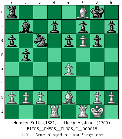Last move : 1-0 2006 November 24 12:2:8 [Event "FICGS__CHESS__CLASS_C__000018"] [Site "FICGS"] [Date "2006.11.12"] [Round "1"] [White "Hensen,Erik"] [Black "Marques,Joao"] [Result "1-0"] [WhiteElo "1821"] [BlackElo "1700"] 1.e4 c5 2.Nf3 e6 3.d4 cxd4 4.Nxd4 Nf6 5.Nc3 a6 6.Bd3 Qc7 7.O-O Nc6 8.Be3 Ne5 9.Be2 Bb4 10.f4 Bxc3 11.fxe5 Bxd4 12.Qxd4 Ng8 13.Bd2 Ne7 14.Qf2 O-O 15.Bb4 Qd8 16.Bh5 g6 17.Be2 b5 18.Rad1 Bb7 19.Qf6 Nc6 20.Bxf8 Qxf6 21.exf6 1-0 Sicilian : Anderssen variation Kingside Castling by player White (move 7) Kingside Castling by player Black (move 14) Player White won this chess game. Follow this game move after move (download)Alekhine is a poet who creates a work of art out of something that would hardly inspire another man to send home a picture post card. (Max Euwe) Rauchen ist dem Schachspieler bei seiner Arbeit, also im Wettkampf, untersagt. (Viktor Kortschnoi) El Ajedrez lo es todo: arte, ciencia y deporte. (Anatoly Karpov) La tactique est l'élément le plus important du milieu de jeu. (Siegbert Tarrasch) A person who never made a mistake never tried anything new. (Albert Einstein)