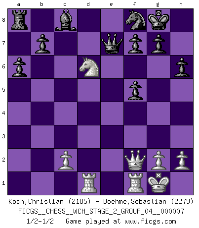 Last move : 1/2-1/2 2010 September 6 1:54:34 [Event "FICGS__CHESS__WCH_STAGE_2_GROUP_04__000007"] [Site "FICGS"] [Date "2010.07.06"] [Round "1"] [White "Koch,Christian"] [Black "Boehme,Sebastian"] [Result "1/2-1/2"] [WhiteElo "2185"] [BlackElo "2279"] 1.e4 c5 2.Nf3 d6 3.d4 cxd4 4.Nxd4 Nf6 5.Nc3 a6 6.Bg5 e6 7.f4 Qb6 8.Qd2 Qxb2 9.Rb1 Qa3 10.e5 dxe5 11.fxe5 Nfd7 12.Ne4 h6 13.Bh4 Qxa2 14.Rd1 Qd5 15.Qe3 Qxe5 16.Be2 Bc5 17.Bg3 Bxd4 18.Rxd4 Qa5+ 19.Rd2 O-O 20.Bd6 Rd8 21.Qg3 Nc6 22.Bc7 Qa1+ 23.Rd1 Qb2 24.O-O Rf8 25.Bd6 Nd4 26.Bg4 Nf5 27.Bxf5 exf5 28.Bxf8 Nxf8 29.Nd6 Qb6+ 30.Qf2 Qc7 31.Ne8 Qe7 32.Nd6 1/2-1/2 Sicilian : Najdorf, 7...Qb6 Kingside Castling by player Black (move 19) Kingside Castling by player White (move 24) This chess game ended in a draw. Follow this game move after move (download)If I win a tournament, I win it by myself. I do the playing. Nobody helps me. (Bobby Fischer) Die meiste Zeit treffe ich auf Gegner, die meine Enkel sein könnten. Ich bin da, um ihnen zu zeigen, dass sie von mir noch einiges lernen können. (Viktor Kortschnoi) Nos gusta pensar. (Gary Kasparov) Il vaut mieux sacrifier les pièces de l'adversaire. (Xavier Tartacover) The obstacle is the path. (Zen proverb)