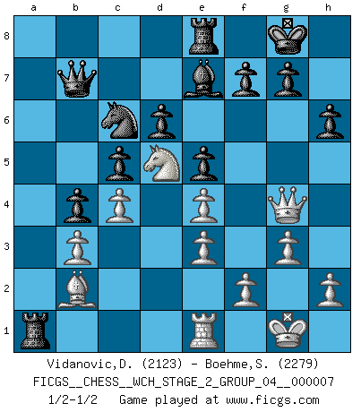 Last move : 1/2-1/2 2010 October 17 21:41:9 [Event "FICGS__CHESS__WCH_STAGE_2_GROUP_04__000007"] [Site "FICGS"] [Date "2010.07.06"] [Round "1"] [White "Vidanovic,Djordje"] [Black "Boehme,Sebastian"] [Result "1/2-1/2"] [WhiteElo "2123"] [BlackElo "2279"] 1.Nf3 c5 2.c4 Nc6 3.Nc3 Nf6 4.g3 e5 5.Bg2 Be7 6.d3 d6 7.O-O h6 8.Nd2 O-O 9.Nde4 Nxe4 10.dxe4 Bg4 11.b3 a6 12.a4 Rb8 13.Nd5 b5 14.axb5 axb5 15.Bd2 Re8 16.Bf3 Bh3 17.Re1 Qc8 18.e3 b4 19.Bc1 Qb7 20.Bg4 Bxg4 21.Qxg4 Ra8 22.Bb2 Rxa1 1/2-1/2 Reti Opening Kingside Castling by player White (move 7) Kingside Castling by player Black (move 8) This chess game ended in a draw. Follow this game move after move (download)Though most people love to look at the games of the great attacking masters, some of the most successful players in history have been the quiet positional players. They slowly grind you down by taking away your space, tying up your pieces, and leaving you with virtually nothing to do ! (Yasser Seirawan) Sitze auf Deine Hände. (Siegbert Tarrasch) No hay precio que no valga la pena por la cabellera del Rey enemigo. (Koblentz) Les échecs sont un jeu terrible. Si vous n'avez pas le centre, votre adversaire a une position plus libre. Par contre, si vous avez le centre, alors vous avez vraiment quelque chose pour laquelle vous inquiéter ! (Siegbert Tarrasch) There are two types of people in this world, good and bad. The good sleep better, but the bad seem to enjoy the waking hours much more. (Woody Allen)
