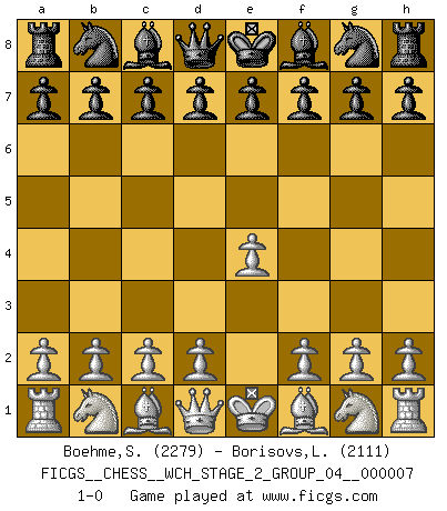 Last move : 1-0 2010 August 5 22:12:20 [Event "FICGS__CHESS__WCH_STAGE_2_GROUP_04__000007"] [Site "FICGS"] [Date "2010.07.06"] [Round "1"] [White "Boehme,Sebastian"] [Black "Borisovs,Leonids"] [Result "1-0"] [WhiteElo "2279"] [BlackElo "2111"] 1.e4 1-0 This chess game has been lost on time (started : 2010.07.06 16:57:58) King's pawn Opening Player White won this chess game. Follow this game move after move (download)Dazzling combinations are for the many, shifting wood is for the few. (Georg Kieninger) Das Schach hält seine Meister in eigenen Banden, Fesseln; auf vielerlei Weise formt es ihren Geist, so dass die innere Freiheit selbst des Stärksten beeinflusst wird. (Albert Einstein) Si pudieramos observar el interior de la cabeza de un jugador de Ajedrez, encontraríamos ahí un mundo lleno de sentimientos, imágenes, ideas, emoción y pasión. (Alfred Binet) Le plus grand jeu de l'esprit jamais inventé, plus vous l'apprenez, plus vous y prenez du plaisir. (Garry Kasparov) When the going gets tactical, the computers get going. (Hyatt)