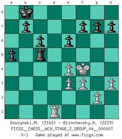 Last move : 0-1 2010 July 28 9:0:24 [Event "FICGS__CHESS__WCH_STAGE_2_GROUP_04__000007"] [Site "FICGS"] [Date "2010.07.06"] [Round "1"] [White "Soszynski,Marek"] [Black "Blinchevsky,Alexander"] [Result "0-1"] [WhiteElo "2164"] [BlackElo "2229"] 1.Nf3 d5 2.c4 c6 3.b3 Nf6 4.Bb2 Bg4 5.d3 Nbd7 6.Nbd2 e6 7.h3 Bxf3 8.Nxf3 Bb4+ 9.Nd2 Nc5 10.Qc2 dxc4 11.bxc4 Qa5 12.e3 Nfe4 13.Bc1 O-O-O 14.dxe4 Rd7 15.Rb1 Rhd8 16.Rxb4 Qxb4 17.f3 Nd3+ 18.Bxd3 Rxd3 19.O-O Rxd2 20.Bxd2 Rxd2 21.Qb3 Qxb3 22.axb3 Rb2 23.Ra1 Kb8 24.Rd1 Rxb3 25.Kf2 Rb2+ 26.Kg3 a5 27.c5 Rc2 28.Kf4 Rxc5 0-1 Reti Opening Queenside Castling by player Black (move 13) Kingside Castling by player White (move 19) Player Black won this chess game. Follow this game move after move (download)Bobby is the most misunderstood, misquoted celebrity walking the face of this earth. (Yasser Seirawan) Wenn es im Universum noch irgendwo intelligente Lebewesen gibt, dann kennen sie Go. (Emanuel Lasker) Personalmente, yo prefiero mirar hacia el futuro en donde un programa de computadora gane el título mundial de Ajedrez. La humanidad necesita una lección de humildad. (Richard Dawkings) On est toujours la mazette de quelqu'un d'autre. (Anonyme) Now be brave and don't look back. Don't look back. (Shmi Skywalker in Star Wars ep.1)