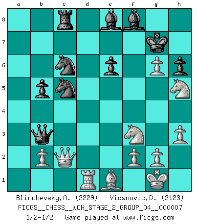 Last move : 1/2-1/2 2010 October 14 13:28:10 [Event "FICGS__CHESS__WCH_STAGE_2_GROUP_04__000007"] [Site "FICGS"] [Date "2010.07.06"] [Round "1"] [White "Blinchevsky,Alexander"] [Black "Vidanovic,Djordje"] [Result "1/2-1/2"] [WhiteElo "2229"] [BlackElo "2123"] 1.d4 d5 2.c4 dxc4 3.Nf3 a6 4.e3 e6 5.Bxc4 Nf6 6.a4 c5 7.O-O Nc6 8.Qe2 Qc7 9.Nc3 Bd6 10.Bd2 O-O 11.Rac1 Rd8 12.dxc5 Bxc5 13.Bd3 Be7 14.Ne4 Nd5 15.Rfd1 h6 16.Ng3 Bd7 17.Bb1 Rac8 18.h3 Be8 19.Qd3 Nf6 20.Qb3 Nd7 21.Bc3 g6 22.Ne4 f5 23.Ba2 Bf7 24.Ng3 Nc5 25.Qc2 Rxd1+ 26.Rxd1 b5 27.axb5 axb5 28.e4 Bf8 29.Be1 Qa7 30.exf5 Qxa2 31.fxg6 Be8 32.Nh5 Qb3 33.Nf6+ Kg7 34.Nh5+ 1/2-1/2 QGA : Alekhine defense Kingside Castling by player White (move 7) Kingside Castling by player Black (move 10) This chess game ended in a draw. Follow this game move after move (download)Everything is in a state of flux, and this includes the world of Chess. (Mikhail Botvinnik) Die starken Figuren des Gegners muss man abtauschen. (José Raúl Capablanca) El Ajedrez lo es todo: arte, ciencia y deporte. (Anatoly Karpov) Les pièces de l'échiquier étaient impitoyables. Elles le retenaient, elles l'absorbaient. Il y avait de l'horreur en cela, mais aussi une harmonie unique. Car, qu'y a-t-il dans le monde, à part les échecs ? (V. Nabokov) Faith : not wanting to know what is true. (Friedrich Nietzsche)