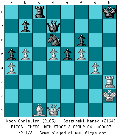 Last move : 1/2-1/2 2010 August 22 18:14:15 [Event "FICGS__CHESS__WCH_STAGE_2_GROUP_04__000007"] [Site "FICGS"] [Date "2010.07.06"] [Round "1"] [White "Koch,Christian"] [Black "Soszynski,Marek"] [Result "1/2-1/2"] [WhiteElo "2185"] [BlackElo "2164"] 1.e4 g6 2.d4 d6 3.c4 Bg7 4.Nc3 a6 5.Nf3 Bg4 6.Be2 Nc6 7.Be3 Nf6 8.d5 Nb8 9.O-O O-O 10.Qb3 Nbd7 11.h3 Bxf3 12.Bxf3 Qc8 13.Rad1 c6 14.Be2 Qc7 15.Qc2 Rab8 16.a3 Ne8 17.b4 c5 18.Na2 a5 19.b5 Nb6 20.Kh1 Bd4 21.Bh6 Bg7 22.Bd2 Nf6 23.f4 Ra8 24.Nc1 Rfe8 25.Bf3 Nfd7 26.a4 Nf8 27.Rde1 e6 28.g3 Qe7 29.f5 Be5 30.Kg2 gxf5 31.Nd3 f6 32.Nxe5 dxe5 33.exf5 exd5 34.Bxd5+ Nxd5 35.cxd5 Qd6 36.Rd1 Nd7 37.Qe4 Red8 38.Be3 Rac8 39.Bd2 Ra8 40.Rf2 c4 41.Bh6 Kh8 42.Qg4 Rg8 43.Qxc4 Rac8 44.Qb3 Nc5 45.Qa3 Qd8 46.Rf3 Ne4 47.Qb3 Qb6 48.g4 Nd6 49.Be3 Qd8 50.Rc1 h5 51.Kh2 Qd7 52.Qd1 Rxc1 53.Bxc1 hxg4 54.hxg4 Rc8 55.Rh3+ 1/2-1/2 Robatsch (Modern) defense Kingside Castling by player White (move 9) Kingside Castling by player Black (move 9) This chess game ended in a draw. Follow this game move after move (download)It is not enough to be a good player... you must also play well. (Siegbert Tarrasch) Es ist schade, dass viele Schachsportler vergessen, wie wichtig Auftreten und angemessene Kleidung sind. (Alexandra Kosteniuk) El Ajedrez es tan inspirador que yo no creo que un buen jugador sea capaz de tener un pensamiento malo durante una partida. (Wilhelm Steinitz) D'abord les bases : Jouez et étudiez, puis étudiez et jouez, ensuite jouez et étudiez, puis étudiez et jouez. Deuxièmement : Donnez toujours le meilleur de vous-même ! (Ken Smith) Political correctness is subjecting us to gross incompetence. (Johann Piek)