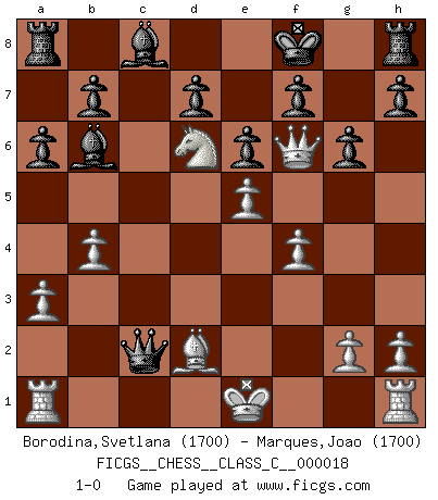 Last move : 1-0 2007 January 8 17:7:32 [Event "FICGS__CHESS__CLASS_C__000018"] [Site "FICGS"] [Date "2006.11.12"] [Round "1"] [White "Borodina,Svetlana"] [Black "Marques,Joao"] [Result "1-0"] [WhiteElo "1700"] [BlackElo "1700"] 1.e4 c5 2.Nf3 e6 3.d4 cxd4 4.Nxd4 Nf6 5.Nc3 a6 6.e5 Ng8 7.Bd3 Qc7 8.Qe2 Bb4 9.Bd2 Ne7 10.f4 Nbc6 11.Nxc6 Nxc6 12.Qg4 g6 13.a3 Ba5 14.b4 Bb6 15.Ne4 Nd4 16.Nd6+ Kf8 17.Qh4 Nxc2+ 18.Bxc2 Qxc2 19.Qf6 1-0 Sicilian : Anderssen variation Player White won this chess game. Follow this game move after move (download)Chess is the gymnasium of the mind. (Blaise Pascal) Im Schach gibt es keinen Platz für Galanterie. (Irving Chernev) Aquellos que dicen que entienden al Ajedrez, no entienden nada. (Robert Hubner) Des idées, des idées, j'en ai cent, j'en ai mille. Des bonnes, des mauvaises, applicables, irréalisables... Il suffit de faire le tri ! (Roos) All war is based on deception. (Sun Tzu)