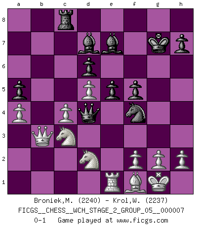Last move : 0-1 2010 November 19 22:32:3 [Event "FICGS__CHESS__WCH_STAGE_2_GROUP_05__000007"] [Site "FICGS"] [Date "2010.07.06"] [Round "1"] [White "Broniek,Mariusz Maciej"] [Black "Krol,Wladyslaw"] [Result "0-1"] [WhiteElo "2240"] [BlackElo "2237"] 1.e4 e5 2.Nf3 Nc6 3.Bb5 a6 4.Ba4 Nf6 5.O-O Be7 6.Re1 b5 7.Bb3 d6 8.c3 Na5 9.Bc2 c5 10.d4 Qc7 11.Nbd2 O-O 12.d5 Bd7 13.b3 c4 14.Bb2 Nb7 15.bxc4 bxc4 16.a4 Rfc8 17.Ba3 Rab8 18.Qe2 Nc5 19.Qxc4 Qa5 20.Bb4 Qd8 21.Qa2 a5 22.Bxc5 Rxc5 23.Nc4 Qc7 24.Bd3 g6 25.Nfd2 Nh5 26.Rab1 Rxb1 27.Nxb1 Kg7 28.Qb3 f5 29.Ncd2 Qa7 30.exf5 Nf4 31.c4 gxf5 32.Bf1 Rc8 33.Nc3 Qd4 0-1 This chess game has been lost on time (started : 2010.07.06 16:58:0) Pavel Hase Polish relay! Ruy Lopez : Closed Kingside Castling by player White (move 5) Kingside Castling by player Black (move 11) Player Black won this chess game. Follow this game move after move (download)There is no remorse like the remorse of Chess. (H. G. Wells) Ohne Leiden bildet sich kein Charakter. (Ernst Freiherr von Feuchtersleben) En la perfecta combinación de Ajedrez como en una historia corta de primera clase, toda la trama y contra trama deberá conducir hacia un final sorprendente, el interes no es mitigado hasta el último momento. (Yates and Winter) On a dit que l'homme se distingue de l'animal par le fait qu'il achète plus de livres qu'il ne peut en lire. Je voudrais suggérer qu'inclure à la liste des livres quelques livres d'échecs rendrait la distinction manifeste. (Edward Lasker) SEO proverb : Make your website optimized for human beings, not for search engines.