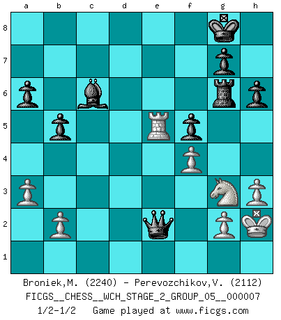 Last move : 1/2-1/2 2010 November 3 7:7:35 [Event "FICGS__CHESS__WCH_STAGE_2_GROUP_05__000007"] [Site "FICGS"] [Date "2010.07.06"] [Round "1"] [White "Broniek,Mariusz Maciej"] [Black "Perevozchikov,Vjacheslav"] [Result "1/2-1/2"] [WhiteElo "2240"] [BlackElo "2112"] 1.e4 e5 2.Nf3 Nc6 3.Bb5 a6 4.Ba4 Nf6 5.O-O b5 6.Bb3 Bb7 7.d3 Be7 8.Re1 O-O 9.Nc3 d6 10.a3 Qd7 11.h3 Rfe8 12.Bg5 h6 13.Bd2 Nd8 14.Nd5 Ne6 15.Nxe7+ Qxe7 16.Ba2 c5 17.Nh4 Qd7 18.Bxe6 Rxe6 19.Nf5 d5 20.f3 Ne8 21.Qe2 Nd6 22.Qf2 Rae8 23.Ng3 Rg6 24.Rad1 f5 25.exd5 Bxd5 26.f4 e4 27.Bc3 exd3 28.Rxe8+ Qxe8 29.Rxd3 Be4 30.Re3 Qc8 31.Be5 Bc6 32.Bxd6 Rxd6 33.Re5 Qd7 34.Qxc5 Rg6 35.Qe3 Qd1+ 36.Kh2 Qxc2 37.Qe2 Qxe2 1/2-1/2 Ruy Lopez : Archangelsk (counterthrust) variation Kingside Castling by player White (move 5) Kingside Castling by player Black (move 8) This chess game ended in a draw. Follow this game move after move (download)Is Bobby Fischer quite sane ? (Salo Flohr) Schachspieler können ausgezeichnet Varianten am Schachbrett berechnen, aber nicht im realen Leben. Zu stark ist der Individualismus im Schach ausgeprägt, und für viele ist ein kleiner momentaner persönlicher Vorteil wichtiger als ein weit größerer Vorteil von morgen. (Anatoly Karpov) Una buena ofensiva y una buena defensa, comienzan ambas con un buen desarrollo. (Bruce A. Moon) Mon pion favori sur ma case favorite ! Bronstein en parlant d'un coup de pion en h5 quand il avait les Noirs. That's absurd. I love it. (Gregory House, House M.D.)