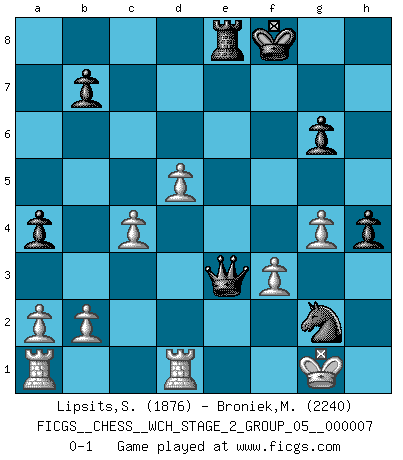 Last move : 0-1 2010 August 26 23:58:28 [Event "FICGS__CHESS__WCH_STAGE_2_GROUP_05__000007"] [Site "FICGS"] [Date "2010.07.06"] [Round "1"] [White "Lipsits,Sasha"] [Black "Broniek,Mariusz Maciej"] [Result "0-1"] [WhiteElo "1876"] [BlackElo "2240"] 1.e4 c5 2.Nf3 d6 3.d4 cxd4 4.Nxd4 Nf6 5.Nc3 a6 6.f3 e5 7.Nb3 Be6 8.Be3 Be7 9.Qd2 h5 10.Nd5 Nxd5 11.exd5 Bf5 12.Be2 Nd7 13.O-O h4 14.h3 O-O 15.c4 Nf6 16.Rfd1 a5 17.Bd3 Bxd3 18.Qxd3 Nh5 19.Nd2 Bg5 20.Bxg5 Qxg5 21.Ne4 Qh6 22.Nc3 Nf4 23.Qf5 a4 24.Kf1 Nh5 25.Ne4 g6 26.Qd7 f5 27.Qe6+ Kh8 28.Nf2 Nf4 29.Qxd6 Qg5 30.Qxe5+ Kg8 31.Ng4 Rae8 32.Qd6 fxg4 33.hxg4 Nxg2 34.Qxf8+ Kxf8 35.Kg1 Qe3+ 0-1 Sicilian : Najdorf Kingside Castling by player White (move 13) Kingside Castling by player Black (move 14) Player Black won this chess game. Follow this game move after move (download)Excellence at Chess is one mark of a scheming mind. (Sir Arthur Conan Doyle) Das Schachspiel hat wie die Liebe, die Musik, die Fähigkeit, den Menschen glücklich zu machen. Ich habe ein leises Gefühl des Bedauerns für jeden, der das Schachspiel nicht kennt, so wie ich jeden bedaure, der die Liebe nicht kennt. (Siegbert Tarrasch) Un mal día en el Ajedrez, es mejor que cualquier buen día en el trabajo. (Anonymous) Pour se monter efficace, un Cavalier a besoin d'avant-postes ! Les Cavaliers font les meilleurs bloqueurs de pions passés. History is a gallery of pictures in which there are few originals and many copies. (Alexis de Tocqueville)
