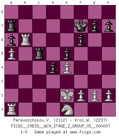 Last move : 1-0 2010 October 18 22:56:54 [Event "FICGS__CHESS__WCH_STAGE_2_GROUP_05__000007"] [Site "FICGS"] [Date "2010.07.06"] [Round "1"] [White "Perevozchikov,Vjacheslav"] [Black "Krol,Wladyslaw"] [Result "1-0"] [WhiteElo "2112"] [BlackElo "2237"] 1.e4 e5 2.Nf3 Nc6 3.Bb5 a6 4.Ba4 Nf6 5.O-O Be7 6.Re1 b5 7.Bb3 d6 8.c3 Na5 9.Bc2 c5 10.d4 Qc7 11.a4 b4 12.cxb4 cxd4 13.bxa5 Qxa5 14.Na3 O-O 15.Nc4 Qc7 16.b3 Be6 17.Bd3 Nd7 18.a5 Nc5 19.Ba3 Nxd3 20.Qxd3 Bxc4 21.Qxc4 Qb7 22.Rec1 Rfb8 23.Qc6 Qxc6 24.Rxc6 Rxb3 25.Bxd6 Bxd6 26.Rxd6 f6 27.Rc6 Ra7 28.Kf1 Kf7 29.Ke2 Rb5 30.Rb6 Rc5 31.Ne1 1-0 Ruy Lopez : Closed Kingside Castling by player White (move 5) Kingside Castling by player Black (move 14) Player White won this chess game. Follow this game move after move (download)Chess is a fighting game which is purely intellectual and includes chance. (Richard Reti) Ich glaube nicht an Psychologie, ich glaube an gute Züge. (Robert James Fischer) Bobby es la celebridad menos entendida y malinterpretada que camina el la faz de esta tierra. (Yasser Seirawan) L'ordinateur a tué l'originalité. Il n'y a plus guère d'aventures sur l'échiquier. (Jacob Murray) Wawaweewa ! (Borat: Cultural learnings of America for make benefit glorious nation of Kazakhstan)