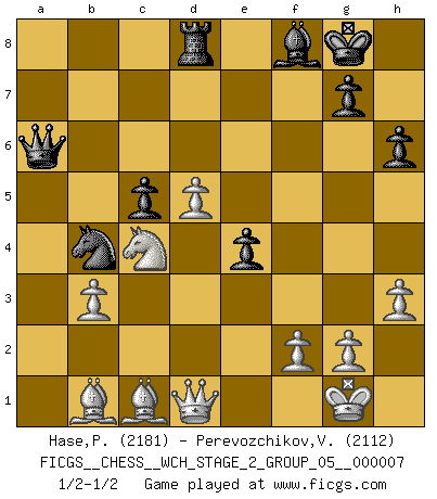 Last move : 1/2-1/2 2010 August 26 17:7:28 [Event "FICGS__CHESS__WCH_STAGE_2_GROUP_05__000007"] [Site "FICGS"] [Date "2010.07.06"] [Round "1"] [White "Hase,Pavel"] [Black "Perevozchikov,Vjacheslav"] [Result "1/2-1/2"] [WhiteElo "2181"] [BlackElo "2112"] 1.e4 e5 2.Nf3 Nc6 3.Bb5 a6 4.Ba4 Nf6 5.O-O Be7 6.Re1 b5 7.Bb3 d6 8.c3 O-O 9.h3 Bb7 10.d4 Re8 11.Nbd2 Bf8 12.a4 h6 13.Bc2 exd4 14.cxd4 Nb4 15.Bb1 c5 16.d5 Nd7 17.Ra3 c4 18.R1e3 Nc5 19.b3 c3 20.Rxc3 f5 21.axb5 axb5 22.Rxa8 Qxa8 23.Nd4 Qa1 24.Nxb5 Ba6 25.Rxc5 dxc5 26.Nc7 Rd8 27.Nxa6 Qxa6 28.Nc4 fxe4 1/2-1/2 Ruy Lopez : Closed Kingside Castling by player White (move 5) Kingside Castling by player Black (move 8) This chess game ended in a draw. Follow this game move after move (download)Chess is a foolish expedient for making idle people believe they are doing something very clever when they are only wasting their time. (George Bernard Shaw) Wer nie einen Fehler gemacht hat, hat nie etwas Neues ausprobiert. (Albert Einstein) El Ajedrez es un juego de pelea el cual es puramente intelectual e incluye la suerte. (Richard Reti) Pour moi, les échecs ne sont pas un jeu mais un art. (Alexandre Alekhine) A woman without a man is like a fish without a bicycle. (Gloria Steinem)