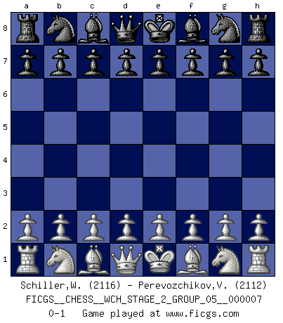 Last move : 0-1 2010 August 5 22:12:20 [Event "FICGS__CHESS__WCH_STAGE_2_GROUP_05__000007"] [Site "FICGS"] [Date "2010.07.06"] [Round "1"] [White "Schiller,Wilfried"] [Black "Perevozchikov,Vjacheslav"] [Result "0-1"] [WhiteElo "2116"] [BlackElo "2112"] 0-1 This chess game has been lost on time (started : 2010.07.06 16:58:0) Player Black won this chess game. Follow this game move after move (download)Morphy was probably the greatest genius of them all. (Bobby Fischer) Wenn ich gewinne bin ich ein Genie. Wenn nicht, dann bin ich keines. (Robert James Fischer) ¿Se han dado cuenta de que Fischer casi nunca ha tenido piezas malas? El las intercambia y las piezas malas se quedan con sus oponenets. (Yuri Balashov) Je menace de comprendre la position. (Anonyme) I can't decide which is riskier; taking crazy risks, or taking advice on crazy risks from a crazy risk taker. (Gregory House in House M.D.)