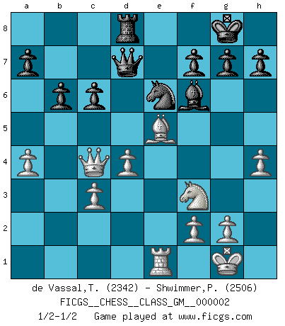 Last move : 1/2-1/2 2010 December 10 14:20:21 [Event "FICGS__CHESS__CLASS_GM__000002"] [Site "FICGS"] [Date "2010.07.06"] [Round "1"] [White "de Vassal,Thibault"] [Black "Shwimmer,Peter"] [Result "1/2-1/2"] [WhiteElo "2342"] [BlackElo "2506"] 1.e4 e5 2.Nf3 Nf6 3.Nxe5 d6 4.Nf3 Nxe4 5.d4 d5 6.Bd3 Nc6 7.O-O Be7 8.c4 Nb4 9.Be2 O-O 10.Nc3 Bf5 11.a3 Nxc3 12.bxc3 Nc6 13.cxd5 Qxd5 14.Bf4 Qd7 15.Re1 Bf6 16.Bd3 Bg6 17.Rb1 b6 18.Rb2 Bxd3 19.Qxd3 Rae8 20.Rbe2 Rxe2 21.Qxe2 Nd8 22.Qc4 c6 23.Be5 Be7 24.a4 Ne6 25.h4 Rd8 26.Bg3 Bf6 27.Be5 1/2-1/2 Petrov : Classical attack Kingside Castling by player White (move 7) Kingside Castling by player Black (move 9) This chess game ended in a draw. Follow this game move after move (download)Of all my Russian books, the defense contains and diffuses the greatest 'warmth' which may seem odd seeing how supremely abstract Chess is supposed to be. (Vladimir Nabokov) Der Traum, für den ich lebe, ist der von einem freien Russland. Viele mögen sagen: Russland hat doch ein Parlament, einen gewählten Präsidenten. Aber ich spüre, dass in meiner Heimat die Angst wiederkehrt. Eine Angst, sich frei zu äußern, bestimmte Dinge zu tun (Garry Kasparov) Con el fin de mejorar tu juego, debes de estudiar los finales antes que todo, ya que mientras que los finales pueden ser estudiados y dominados por sí mismos, el juegomedio y la apertura deben de ser estudiados en relación con los finales. (José Raúl Capablanca) Plusieurs personnes se sont demandées comment Tal faisait pour gagner... En fait, c'est très simple ! Il met ses pièces au centre de l'échiquier et les sacrifie quelque part ! (David Bronstein) Internal peace cannot coexist with external war. (Don Groves)