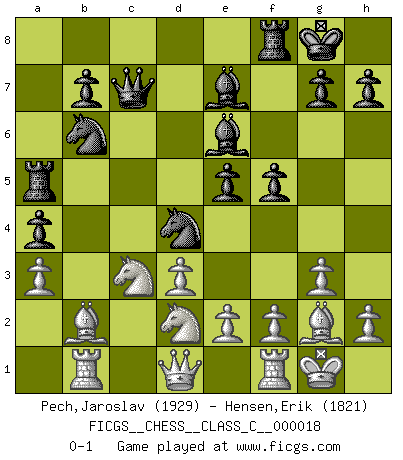 Last move : 0-1 2007 February 20 21:39:18 [Event "FICGS__CHESS__CLASS_C__000018"] [Site "FICGS"] [Date "2006.11.12"] [Round "1"] [White "Pech,Jaroslav"] [Black "Hensen,Erik"] [Result "0-1"] [WhiteElo "1929"] [BlackElo "1821"] 1.c4 e5 2.Nc3 Nf6 3.Nf3 Nc6 4.g3 d5 5.cxd5 Nxd5 6.Bg2 Nb6 7.O-O Be7 8.a3 O-O 9.b4 Be6 10.d3 a5 11.b5 Nd4 12.Nd2 c6 13.bxc6 Nxc6 14.Bb2 a4 15.Rc1 Ra5 16.Nf3 Nd4 17.Rb1 f5 18.Nd2 Qc7 0-1 English Opening Kingside Castling by player White (move 7) Kingside Castling by player Black (move 8) Player Black won this chess game. Follow this game move after move (download)A big shock; the best chess player in history has passed away. (Lajos Portisch, about Bobby Fischer's death) Privat ist Kortschnoi kein schlechter Mensch, sehr sympathisch. Aber während des Spiels ist er grausam. Er will dich töten. (Miguel Najdorf) ¡Examina movidas que hagan daño! Un buen ojo for movidas desvastantes es mucho mas importante que el conocimiento de principios estratégicos. (Purdy) Les échecs, c'est l'art d'analyser. (Mikhail Botvinnik) Chess, like love, like music, has the power to make people happy. (Siegbert Tarrasch)