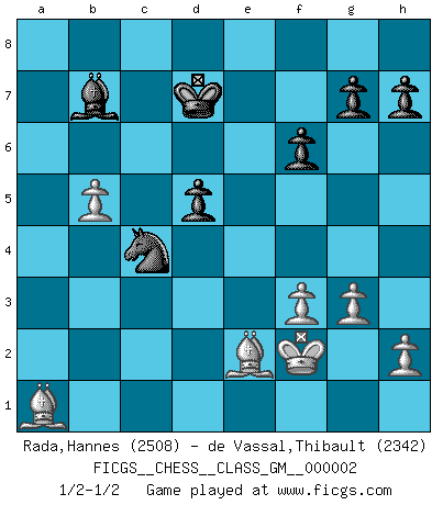 Last move : 1/2-1/2 2011 June 15 0:9:9 [Event "FICGS__CHESS__CLASS_GM__000002"] [Site "FICGS"] [Date "2010.07.06"] [Round "1"] [White "Rada,Hannes"] [Black "de Vassal,Thibault"] [Result "1/2-1/2"] [WhiteElo "2508"] [BlackElo "2342"] 1.Nf3 Nf6 2.c4 e6 3.Nc3 Bb4 4.Qc2 O-O 5.a3 Bxc3 6.Qxc3 b6 7.b4 Bb7 8.Bb2 d6 9.g3 Nbd7 10.Bg2 Ne5 11.O-O Nxf3+ 12.exf3 c5 13.d4 cxd4 14.Qxd4 d5 15.c5 bxc5 16.Qxc5 Nd7 17.Qe3 Re8 18.f4 Nb6 19.Rfc1 Qd7 20.Qc3 f6 21.Qc7 Re7 22.Qxd7 Rxd7 23.Bd4 Kf7 24.b5 Nc4 25.a4 a6 26.b6 a5 27.Bf1 Rc8 28.f3 Rd6 29.Rab1 Rdc6 30.Kf2 Ke7 31.Rb5 Kd6 32.Rd1 Na3 33.Rxa5 Nc2 34.Bb2 Rxb6 35.Rb1 Kd7 36.Rb5 Rxb5 37.axb5 Ra8 38.Bd3 Nb4 39.Be2 Ra2 40.Bd4 e5 41.fxe5 Nd3+ 42.Ke3 Nxe5 43.Ra1 Nc4+ 44.Kf2 Rxa1 45.Bxa1 1/2-1/2 Reti Opening Kingside Castling by player Black (move 4) Kingside Castling by player White (move 11) This chess game ended in a draw. Follow this game move after move (download)Those who say they understand Chess, understand nothing. (Robert Hubner) Obendrein hat der FIDE-Präsident den Revolutionsführer Gaddafi zum »Großmeister« ernannt, am Ende der WM. Das ist lächerlich! (Joel Lautier) Un juego de Ajedrez es un dialogo, una conversación entre un jugador y su oponente. Cada movimiento del oponente puede contener amenazas o tropiezos, pero un jugador no se puede defender de las amenazas o tomar ventaja de los tropiezos si es que no se pregunta a sí mismo: ¿Que es lo que mi oponente va a hacer después de cada movida?. (Bruce A. Moon) Avant la finale, les dieux ont créé le milieu de partie. (Tarrasch) No, no, you're not thinking; you're just being logical. (Niels Bohr)