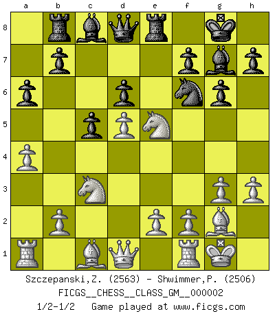 Last move : 1/2-1/2 2010 July 20 21:50:43 [Event "FICGS__CHESS__CLASS_GM__000002"] [Site "FICGS"] [Date "2010.07.06"] [Round "1"] [White "Szczepanski,Zbigniew"] [Black "Shwimmer,Peter"] [Result "1/2-1/2"] [WhiteElo "2563"] [BlackElo "2506"] 1.d4 Nf6 2.c4 e6 3.g3 c5 4.d5 exd5 5.cxd5 d6 6.Nc3 g6 7.Bg2 Bg7 8.Nf3 O-O 9.O-O Re8 10.Nd2 a6 11.a4 Nbd7 12.h3 Rb8 13.Nc4 Ne5 14.Nxe5 1/2-1/2 Catalan Opening Kingside Castling by player Black (move 8) Kingside Castling by player White (move 9) This chess game ended in a draw. Follow this game move after move (download)Weak points or holes in the opponent's position must be occupied by pieces not Pawns. (Siegbert Tarrasch) Jeder weiß, dass Gasprom Putins persönliches Machtinstrument ist. Die Firma wird vom Kreml aus geleitet und wird schon deshalb nie transparent sein. (Garry Kasparov) Juega la Apertura como un libro, el Juego Medio como un mago y los Finales como una máquina. (Spielmann) Ne tendez aucun piège pour le plaisir ! Ne jouez rien dans l'espoir que l'adversaire réagisse de façon stupide ! Prenez toujours pour acquis que l'adversaire va trouver le meilleur coup ! Ne jouez jamais de coup dans l'espoir que l'adversaire ne voie pas la menace ! Chacun de vos coups doit améliorer la position d'une façon ou d'une autre. Whenever people agree with me, I always feel I must be wrong. (Oscar Wilde)