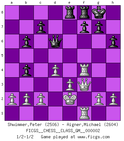 Last move : 1/2-1/2 2011 February 25 15:8:52 [Event "FICGS__CHESS__CLASS_GM__000002"] [Site "FICGS"] [Date "2010.09.03"] [Round "1"] [White "Shwimmer,Peter"] [Black "Aigner,Michael"] [Result "1/2-1/2"] [WhiteElo "2506"] [BlackElo "2604"] 1.Nc3 d5 2.e3 e5 3.d4 e4 4.f3 Bb4 5.Bd2 Nc6 6.fxe4 Bxc3 7.Bxc3 Qh4+ 8.Kd2 Qxe4 9.Qf3 Nf6 10.Bd3 Qe7 11.Qf4 Nh5 12.Qf3 Nf6 13.Ne2 Bg4 14.Qf4 Bxe2 15.Kxe2 O-O 16.Raf1 a5 17.Rf3 Ne4 18.Qf5 Nb4 19.Bxe4 dxe4 20.Rf4 Qd6 21.Bxb4 axb4 22.Ra1 b6 23.Qxe4 Rae8 24.Qf3 h6 25.Rf1 1/2-1/2 Dunst (Sleipner, Heinrichsen) Opening Kingside Castling by player Black (move 15) This chess game ended in a draw. Follow this game move after move (download)It began to feel as though you were playing against Chess itself. - On playing against Robert Fischer. (Walter Shipman) Um sich vor der Gefahr einer Erkältung zu schützen, sorge der wanderlustige König beizeiten für ein brauchbares Versteck. (Aaron Nimzowitsch) Desconfianza es la característica mas necesaria de un jugador de Ajedrez. (Siegbert Tarrasch) L'ordinateur a tué l'originalité. Il n'y a plus guère d'aventures sur l'échiquier. (Jacob Murray) Now the reason the enlightened prince and the wise general conquer the enemy whenever they move and their achievements surpass those of ordinary men is foreknowledge. (Sun Tzu)
