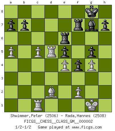 Last move : 1/2-1/2 2010 December 13 21:59:23 [Event "FICGS__CHESS__CLASS_GM__000002"] [Site "FICGS"] [Date "2010.07.06"] [Round "1"] [White "Shwimmer,Peter"] [Black "Rada,Hannes"] [Result "1/2-1/2"] [WhiteElo "2506"] [BlackElo "2508"] 1.Nf3 Nf6 2.c4 g6 3.Nc3 Bg7 4.e4 d6 5.d4 O-O 6.Be2 e5 7.Be3 Ng4 8.Bg5 f6 9.Bc1 Nc6 10.d5 Nd4 11.h3 Nxe2 12.Qxe2 Nh6 13.a4 Nf7 14.O-O f5 15.a5 f4 16.Bd2 Ng5 17.Rfc1 Nxf3+ 18.Qxf3 Qh4 19.c5 g5 20.Nb5 Rf6 21.g3 Qxh3 22.Nxc7 Rh6 23.Ra3 Qh2+ 24.Kf1 Rb8 25.Ne6 Bd7 26.Rb3 Qh3+ 27.Qg2 Bxe6 28.dxe6 Qxe6 29.Rd3 Qd7 30.Kg1 Rc8 31.b4 Qa4 32.Qf3 dxc5 33.Qg4 Rf8 34.Qd7 Qc6 35.Qd5+ Qxd5 36.Rxd5 Re6 37.bxc5 Rf7 38.g4 1/2-1/2 Reti Opening Kingside Castling by player Black (move 5) Kingside Castling by player White (move 14) This chess game ended in a draw. Follow this game move after move (download)If one piece is badly posted, the whole game is bad. (Tarrasch) Frage: Gibt es etwas was Sie mehr lieben als Autobahnen ohne Tempobegrenzungen? - Antwort: Deutsche Frauen ohne Tempobegrenzungen. (Loek van Wely) Jugadores de primera clase pierden en contra de jugadores de segunda clase porque los jugadores de segunda clase a veces juegan una partida de primer clase. (Siegbert Tarrasch) Les Echecs sont et restent toujours un combat, un combat intégral comme la boxe, la lutte ou un autre sport, et où il doit y avoir un vainqueur et un vaincu. (Joseph Emil Diemer) Think like a man of action, act like a man of thought. (Henri Louis Bergson)