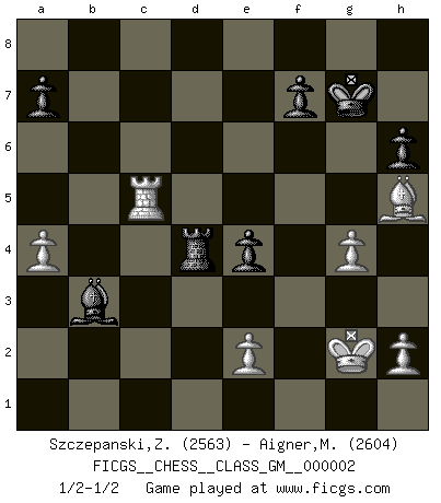 Last move : 1/2-1/2 2011 February 5 19:17:22 [Event "FICGS__CHESS__CLASS_GM__000002"] [Site "FICGS"] [Date "2010.09.03"] [Round "1"] [White "Szczepanski,Zbigniew"] [Black "Aigner,Michael"] [Result "1/2-1/2"] [WhiteElo "2563"] [BlackElo "2604"] 1.d4 Nf6 2.c4 e6 3.g3 d5 4.Nf3 Be7 5.Bg2 O-O 6.O-O dxc4 7.Ne5 c5 8.dxc5 Qc7 9.Nxc4 Qxc5 10.b3 Rd8 11.Nbd2 Qc7 12.Bb2 Nc6 13.Rc1 Bd7 14.Ne5 Qa5 15.Nd3 Qa6 16.Nc5 Bxc5 17.Rxc5 e5 18.Qb1 Be6 19.Ne4 h6 20.Nxf6+ gxf6 21.Qe4 Rac8 22.a4 Nd4 23.Rxc8 Bxc8 24.Bxd4 Rxd4 25.Qe3 Kg7 26.f4 Qd6 27.fxe5 fxe5 28.Rc1 Be6 29.Bxb7 Rb4 30.Bf3 e4 31.Bh5 Qe5 32.Rc5 Qf6 33.Kg2 Bxb3 34.g4 Qd4 35.Qxd4+ Rxd4 1/2-1/2 Catalan Opening Kingside Castling by player Black (move 5) Kingside Castling by player White (move 6) This chess game ended in a draw. Follow this game move after move (download)It's always better to sacrifice your opponent's men. (Savielly Tartakover) Versuche, dich von der Sklaverei der Eröffnungsvarianten zu befreien. Stattdessen soll man gewisse Typenpositionen erlernen, die man eingehend analysiert. (Aaron Nimzowitsch) Con el fin de mejorar tu juego, debes de estudiar los finales antes que todo, ya que mientras que los finales pueden ser estudiados y dominados por sí mismos, el juegomedio y la apertura deben de ser estudiados en relación con los finales. (José Raúl Capablanca) Mais l'homme est une créature légère et illogique : semblable au joueur d'échecs, il n'aime que le processus du but à atteindre, non le but lui-même. (Dostoïevsky) No man has ever achieved immortality in his own life time. (Unknown)