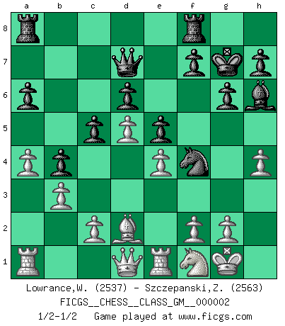 Last move : 1/2-1/2 2010 December 2 19:59:34 [Event "FICGS__CHESS__CLASS_GM__000002"] [Site "FICGS"] [Date "2010.07.06"] [Round "1"] [White "Lowrance,Wayne"] [Black "Szczepanski,Zbigniew"] [Result "1/2-1/2"] [WhiteElo "2537"] [BlackElo "2563"] 1.e4 c5 2.Nf3 Nc6 3.Bb5 g6 4.Nc3 Bg7 5.O-O e5 6.d3 Nge7 7.Bc4 O-O 8.h3 d6 9.Re1 Be6 10.Ng5 Bxc4 11.dxc4 Nd4 12.Nf3 Rc8 13.Nd2 a6 14.Nd5 Ne6 15.a4 Nxd5 16.cxd5 Nf4 17.Nc4 b5 18.Ne3 Qd7 19.h4 Ra8 20.Bd2 Bh6 21.Nf1 Kg7 22.b3 b4 1/2-1/2 Sicilian : Nimzovich-Rossolimo attack (with ...g6, without ...d6) Kingside Castling by player White (move 5) Kingside Castling by player Black (move 7) This chess game ended in a draw. Follow this game move after move (download)Chess is so inspiring that I do not believe a good player is capable of having an evil thought during the game. (Wilhelm Steinitz) Kombinieren und Schwarzhandel gehören verboten. (Savielly Grigorievitsch Tartakower) La estratégia requiere pensar, la táctica requiere observación. (Max Euwe) Si rien de grave n'est détecté lors de l'analyse d'une position, on joue alors le coup. Seconde règle de Blumenfeld. The only sure thing about luck is that it will change. (Wilson Mizner)