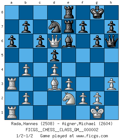 Last move : 1/2-1/2 2011 May 7 20:22:13 [Event "FICGS__CHESS__CLASS_GM__000002"] [Site "FICGS"] [Date "2010.09.03"] [Round "1"] [White "Rada,Hannes"] [Black "Aigner,Michael"] [Result "1/2-1/2"] [WhiteElo "2508"] [BlackElo "2604"] 1.d4 Nf6 2.c4 e6 3.Nc3 Bb4 4.e3 O-O 5.Nge2 d5 6.a3 Be7 7.Nf4 c6 8.cxd5 Nxd5 9.Bd3 Nd7 10.O-O Qc7 11.Ncxd5 exd5 12.Bd2 Nf6 13.Bb4 Bxb4 14.axb4 Bg4 15.Qc2 a6 16.h3 Bd7 17.Ra3 Qd8 18.Ne2 g6 19.Qc5 Re8 20.Rfa1 Rb8 21.Qa5 Qc8 22.Ng3 Re7 23.Qc5 Qf8 24.Qd6 Be6 25.Qf4 Nd7 26.Qd6 Rbe8 27.Ne2 Qh6 1/2-1/2 Nimzo-Indian : 4.e3 O-O Kingside Castling by player Black (move 4) Kingside Castling by player White (move 10) This chess game ended in a draw. Follow this game move after move (download)Everything is in a state of flux, and this includes the world of Chess. (Mikhail Botvinnik) Es hat in meinem Leben Zeiten gegeben, da ich sehr nahe daran war zu glauben, daß ich auch nicht eine einzige Schachpartie verlieren könnte. (José Raúl Capablanca) Existen dos clases de sacrificios: los correctos y los míos. (Mikhail Tal) Le joueur d'Echecs qui veut atteindre le top est obligé de développer son propre credo créatif. Alexeï Stepanovicth Souétine. Il est facile d'écrire des livres ! Ce qui est difficile, c'est de jouer ! (Alexeï Stepanovicth Souétine) Experiences are the keys to life. (Daniel Parmet)