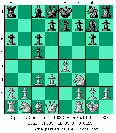 Last move : 1-0 2010 July 18 2:37:34 [Event "FICGS__CHESS__CLASS_B__000115"] [Site "FICGS"] [Date "2010.07.07"] [Round "1"] [White "Ropokis,Dimitrios"] [Black "Doan,Binh"] [Result "1-0"] [WhiteElo "1800"] [BlackElo "1800"] 1.e4 c5 2.Nf3 Nc6 3.Bb5 g6 4.O-O Bg7 5.c3 a6 6.Bxc6 bxc6 7.d3 1-0 Sicilian : Nimzovich-Rossolimo attack (with ...g6, without ...d6) Kingside Castling by player White (move 4) Player White won this chess game. Follow this game move after move (download)The tactician knows what to do when there is something to do; whereas the strategian knows what to do when there is nothing to do. (Gerald Abrahams) Wie gewinnt Tal? Er entwickelt alle seine Figuren in die Brettmitte und opfert sie dann irgendwo. (Robert James Fischer) No es suficiente ser un buen jugador, se debe también de jugar bién. (Siegbert Tarrasch) Celui qui prend des risques peut perdre, celui qui n'en prend pas perd toujours. (Xavier Tartacover) Beta. Software undergoes beta testing shortly before it's released. Beta is latin for still doesn't work. (Anonymous)