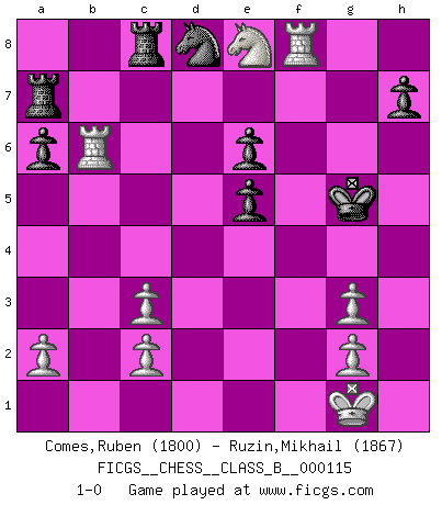 Last move : 1-0 2010 July 20 7:14:49 [Event "FICGS__CHESS__CLASS_B__000115"] [Site "FICGS"] [Date "2010.07.07"] [Round "1"] [White "Comes,Ruben"] [Black "Ruzin,Mikhail"] [Result "1-0"] [WhiteElo "1800"] [BlackElo "1867"] 1.e4 c5 2.Nf3 d6 3.d4 cxd4 4.Nxd4 Nf6 5.Nc3 a6 6.Be2 e6 7.f4 Qc7 8.O-O Be7 9.Qe1 b5 10.Qg3 b4 11.e5 dxe5 12.fxe5 Bc5 13.Be3 O-O 14.exf6 Qxg3 15.hxg3 bxc3 16.fxg7 Rd8 17.bxc3 e5 18.Bc4 Ra7 19.Nf5 Bxe3+ 20.Nxe3 Be6 21.Bxe6 fxe6 22.Ng4 Nc6 23.Rab1 Kxg7 24.Rb6 Rc8 25.Nf6 Nd8 26.Ne8+ Kg6 27.Rf6+ Kg5 28.Rf8 1-0 Sicilian : Najdorf, Opovcensky variation Kingside Castling by player White (move 8) Kingside Castling by player Black (move 13) Player White won this chess game. Follow this game move after move (download)When in doubt... play Chess ! (Tevis) Der Traum, für den ich lebe, ist der von einem freien Russland. Viele mögen sagen: Russland hat doch ein Parlament, einen gewählten Präsidenten. Aber ich spüre, dass in meiner Heimat die Angst wiederkehrt. Eine Angst, sich frei zu äußern, bestimmte Dinge zu tun (Garry Kasparov) Con el fin de mejorar tu juego, debes de estudiar los finales antes que todo, ya que mientras que los finales pueden ser estudiados y dominados por sí mismos, el juegomedio y la apertura deben de ser estudiados en relación con los finales. (José Raúl Capablanca) Vouloir jouer aux échecs contre soi-même est aussi paradoxal que vouloir marcher sur son ombre. (Stefan Zweig) Indecision is the key to flexibility. (Unknown)