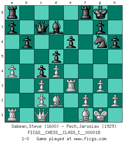 Last move : 1-0 2007 February 16 4:31:1 [Event "FICGS__CHESS__CLASS_C__000018"] [Site "FICGS"] [Date "2006.11.12"] [Round "1"] [White "Sabean,Steve"] [Black "Pech,Jaroslav"] [Result "1-0"] [WhiteElo "1600"] [BlackElo "1929"] 1.e4 e6 2.d4 d5 3.Nc3 Bb4 4.e5 c5 5.a3 Bxc3+ 6.bxc3 Ne7 7.Nf3 Qa5 8.Bd2 Nbc6 9.a4 Bd7 10.Bb5 Qc7 11.O-O O-O 12.Re1 b6 13.Bd3 h6 14.Qc1 c4 15.Bf1 f6 16.g3 fxe5 17.Nxe5 Nxe5 18.Rxe5 Ng6 19.Re3 1-0 This chess game has been lost on time (started : 2006.11.12 23:18:7) French : Winawer, Advance, positional Main line Kingside Castling by player White (move 11) Kingside Castling by player Black (move 11) Player White won this chess game. Follow this game move after move (download)Your body has to be in top condition. Your Chess deteriorates as your body does. You can't separate body from mind. (Bobby Fischer) In der Schule lernt man nichts. Es ist nur Zeitverschwendung. (Robert James Fischer) Combinaciones deslumbrantes son para la mayoría, mover madera es para los pocos. (Georg Kieninger) On n'a jamais que l'âge auquel on a commence à jouer aux échecs car après on cesse de vieillir. (Capablanca) The Internet isn't free. It just has an economy that makes no sense to capitalism. (Brad Shapcott)
