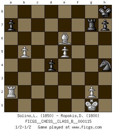 Last move : 1/2-1/2 2010 October 14 17:52:18 [Event "FICGS__CHESS__CLASS_B__000115"] [Site "FICGS"] [Date "2010.07.07"] [Round "1"] [White "Solino,Leonardo"] [Black "Ropokis,Dimitrios"] [Result "1/2-1/2"] [WhiteElo "1850"] [BlackElo "1800"] 1.e4 c6 2.d4 d5 3.e5 Bf5 4.Nf3 e6 5.Be2 Bb4+ 6.Nbd2 Nd7 7.O-O Ne7 8.c3 Ba5 9.h3 O-O 10.Nh4 c5 11.Nxf5 Nxf5 12.Nf3 cxd4 13.cxd4 Rc8 14.Bd3 Nb8 15.Bg5 Qd7 16.Nh4 Nxh4 17.Bxh4 Bd8 18.Qg4 g6 19.Bxd8 Qxd8 20.Rfd1 Nc6 21.Bf1 Qb6 22.Rab1 Rc7 23.b4 Ne7 24.a4 Rc3 25.a5 Qc7 26.a6 bxa6 27.Bxa6 Nf5 28.Qf4 f6 29.Bf1 g5 30.Qg4 fxe5 31.Qxg5+ Kh8 32.dxe5 Rxh3 33.Re1 Rh6 34.Rb3 Rg6 35.Qd2 Nh4 36.R1e3 Rg4 37.Qc3 Qf7 38.Qe1 Rf4 39.Rb2 Rg8 40.Rg3 Rfg4 41.Ra2 d4 42.Bd3 Qg7 43.b5 Rxg3 44.fxg3 Qxg3 45.Qxg3 Rxg3 46.Bc4 Rg7 47.Bxe6 1/2-1/2 Caro-Kann : Advance variation Kingside Castling by player White (move 7) Kingside Castling by player Black (move 9) This chess game ended in a draw. Follow this game move after move (download)Chess is war over the board. The object is to crush the opponents mind. (Bobby Fischer) Ein Remis kann durch Wiederholung von drei Zügen oder durch einen schlechte Zug erreicht werden. (Savielly Grigorievitsch Tartakower) No soy una persona materialista y por eso, no resiento la falta o pérdida del dinero. La ausencia de cosas mundanas carece de importancia. Ya que el Ajedrez es una forma en la que puedo ser tan materialista como yo desee sin tener la necesidad de vender mi alma. (Jamie Walter Adams) A ce moment-là, je menaçais de comprendre la position ! (Clément L'Heureux) All men can see these tactics whereby I conquer, but what none can see is the strategy out of which victory is evolved. (Sun Tzu)