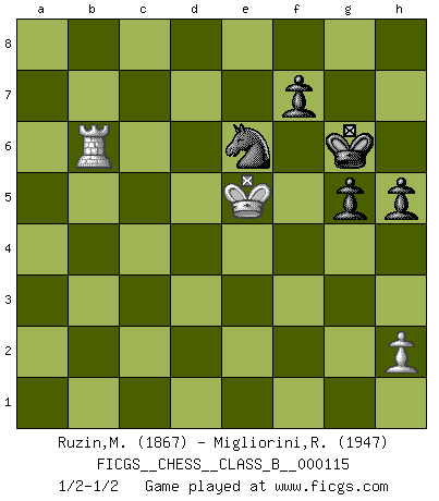 Last move : 1/2-1/2 2010 November 20 19:29:51 [Event "FICGS__CHESS__CLASS_B__000115"] [Site "FICGS"] [Date "2010.07.07"] [Round "1"] [White "Ruzin,Mikhail"] [Black "Migliorini,Roberto"] [Result "1/2-1/2"] [WhiteElo "1867"] [BlackElo "1947"] 1.d4 d5 2.c4 e6 3.Nc3 Nf6 4.Bg5 Be7 5.e3 O-O 6.Nf3 Nbd7 7.Rc1 c6 8.Bd3 dxc4 9.Bxc4 Nd5 10.Bxe7 Qxe7 11.O-O Nxc3 12.Rxc3 e5 13.e4 exd4 14.Qxd4 b5 15.Be2 c5 16.Qd5 Rb8 17.Rd1 Rb6 18.Qd2 Qxe4 19.Re3 Qf4 20.Re7 Qxd2 21.Rxd2 Rb7 22.Ng5 Nb6 23.Rxb7 Bxb7 24.Bxb5 h6 25.Nh3 c4 26.Nf4 a6 27.Rd6 Nc8 28.Rd7 axb5 29.Rxb7 Rd8 30.f3 g5 31.Ne2 Rd2 32.Kf1 Nd6 33.Rb6 Kf8 34.Ke1 Rd5 35.Nc3 Re5+ 36.Kd2 Ke7 37.a4 bxa4 38.Nxa4 Rd5+ 39.Kc2 Nf5 40.Kc3 h5 41.b4 cxb3 42.Rxb3 Ne3 43.Nb6 Rf5 44.Kd4 Nxg2 45.Nd5+ Kf8 46.Ke4 Nh4 47.f4 Kg7 48.Rh3 Rxd5 49.Kxd5 Ng6 50.Ra3 Nxf4+ 51.Ke5 Kg6 52.Ra6+ Ne6 53.Rb6 1/2-1/2 QGD : Orthodox defense Kingside Castling by player Black (move 5) Kingside Castling by player White (move 11) 10 pieces endgame at move 48 : White KRPP , Black KRNPPP WHITE : King + 1 Rook 2 Pawns BLACK : King + 1 Rook 1 Knight 3 Pawns 9 pieces endgame at move 49 : White KRPP , Black KNPPP WHITE : King + 1 Rook 2 Pawns BLACK : King + 1 Knight 3 Pawns 8 pieces endgame at move 50 : White KRP , Black KNPPP WHITE : King + 1 Rook 1 Pawn BLACK : King + 1 Knight 3 Pawns This chess game ended in a draw. Follow this game move after move (download)We must make sure that Chess will not be like a dead language, very interesting, but for a very small group. (Sytze Faber) Ivan Sokolov treibt mich als Beifahrer an mit go Loeky go - . (Loek van Wely) Aunque la mayoría de la gente disfruta observar las partidas de los grandes Maestros de ataque, algunos de los jugadores mas notables en la historia han sido los jugadores silenciosos posicionales. Lentamente ellos te aplastan despojandote de tu espacio, congestionando tus piezas y dejandote virtualmente sin nada que hacer. (Yasser Seirawan) Mais n'est-ce pas déjà le limiter injurieusement que d'appeler les échecs un jeu? N'est-ce pas aussi une science, un art, ou quelque chose qui, comme le cercueil de Mahomet entre ciel et terre, est suspendu entre l'un et l'autre, et qui réunit un nombre incroyable de contraires ? (Stefan Zweig) I know the human being and fish can coexist peacefully. (George W. Bush, Saginaw sept. 29, 2000)
