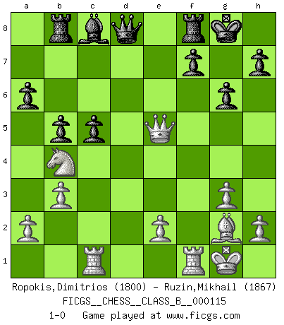 Last move : 1-0 2010 July 13 13:44:45 [Event "FICGS__CHESS__CLASS_B__000115"] [Site "FICGS"] [Date "2010.07.07"] [Round "1"] [White "Ropokis,Dimitrios"] [Black "Ruzin,Mikhail"] [Result "1-0"] [WhiteElo "1800"] [BlackElo "1867"] 1.Nf3 Nf6 2.g3 g6 3.c4 c5 4.Nc3 Nc6 5.Bg2 Bg7 6.O-O O-O 7.d4 cxd4 8.Nxd4 Nxd4 9.Qxd4 d6 10.Qd3 Nd7 11.b3 Ne5 12.Qd2 Rb8 13.Bb2 a6 14.Nd5 b5 15.f4 Ng4 16.Bxg7 Kxg7 17.Rac1 e6 18.Qd4+ Kg8 19.Nb4 e5 20.fxe5 Nxe5 21.c5 dxc5 22.Qxe5 1-0 Reti : King's Indian attack Kingside Castling by player White (move 6) Kingside Castling by player Black (move 6) Player White won this chess game. Follow this game move after move (download)A man that will take back a move at Chess will pick a pocket. (Richard Fenton) Wenn ich Weiß habe gewinne ich weil ich Weiß habe, wenn ich Schwarz habe gewinne ich weil ich Bogoljubov bin. (Efim Bogoljubov) Yo no le temo a Spassky. Todos saben que yo soy el mejor. Uno no necesita un torneo para probarlo. (Bobby Fischer) Que feriez-vous si vous étiez en train de jouer aux échecs et que la fin du monde arrive ? Je continuerais à jouer. (Saint Borromée) Success without honor is an unseasoned dish; it will satisfy your hunger, but it won't taste good. (Joe Paterno)