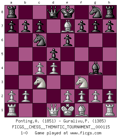 Last move : 1-0 2010 August 9 9:22:16 [Event "FICGS__CHESS__THEMATIC_TOURNAMENT__000115"] [Site "FICGS"] [Date "2010.07.08"] [Round "1"] [White "Ponting,Andrew"] [Black "Guralivu,Paul-Iosif"] [Result "1-0"] [WhiteElo "1851"] [BlackElo "1385"] 1.d4 d5 2.c4 Nc6 3.Nf3 Bg4 4.Nc3 e6 5.Bg5 Be7 6.Bxe7 1-0 QGD : Chigorin defense Player White won this chess game. Follow this game move after move (download)Some sacrifices are sound; the rest are mine. (Mikhail Tal) Woher wissen wir, daß der Neanderthaler Blindschach gespielt hat? -- Bei Ausgrabungen wurden keine Schachbretter und Figuren gefunden. (Anonymous) Vive, pierde y aprende al observar a tu oponente como gana. (Amber Steenbock) Nous vivons dans un monde échiquéen : chaque jour qui passe est un défi à relever. (Philosophe Sasha) The problem with manipulation is that people can turn on you. (Horatio Caine, C.S.I. Miami)