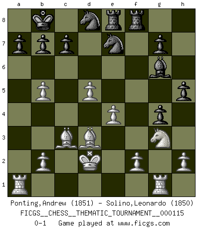 Last move : 0-1 2010 December 22 22:25:37 [Event "FICGS__CHESS__THEMATIC_TOURNAMENT__000115"] [Site "FICGS"] [Date "2010.07.08"] [Round "1"] [White "Ponting,Andrew"] [Black "Solino,Leonardo"] [Result "0-1"] [WhiteElo "1851"] [BlackElo "1850"] 1.d4 d5 2.c4 Nc6 3.cxd5 Qxd5 4.Nf3 e5 5.Nc3 Bb4 6.Bd2 Bxc3 7.Bxc3 e4 8.Nd2 Nge7 9.e3 Be6 10.Qb3 Qxb3 11.axb3 f5 12.g4 fxg4 13.Nxe4 Bd5 14.Bd3 O-O-O 15.Rg1 h5 16.b4 Rde8 17.Ng3 Kb8 18.e4 Bf7 19.Kd2 Rhf8 20.b5 Nd8 21.d5 Bg6 0-1 This chess game has been lost on time (started : 2010.07.08 6:58:49) QGD : Chigorin defense Queenside Castling by player Black (move 14) Player Black won this chess game. Follow this game move after move (download)Discovered check is the dive bomber of the Chessboard. (Reuben Fine) Das Schach ist nichts für kleine Geister, es beansprucht einen vollen Mann, der sich nicht sklavisch an das Überlieferte hält, sondern selbständig die Tiefen des Spiels zu ergründen sucht. (Wilhelm Steinitz) El Ajedrez es un juego terrible. Si no dominas el centro, tu oponente tiene una posición mas libre. Si tu tienes el centro, entonces realmente tienes algo de que preocuparte. (Siegbert Tarrasch) Lorsque vous vous retrouvez devant une position atroce, ne tendez pas un ultime piège dérisoire avec l'intention d'abandonner si l'adversaire le déjoue ! Faites-vous plutôt un devoir de résister comme si votre vie en dépendait. Jouez le coup qui vous déplairait au centuple si vous étiez dans la peau de votre tortionnaire ! I've never seen so many men wasted so badly. (Blondie in The Good, The Bad and The Ugly)