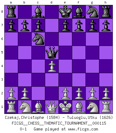 Last move : 0-1 2010 August 17 10:44:21 [Event "FICGS__CHESS__THEMATIC_TOURNAMENT__000115"] [Site "FICGS"] [Date "2010.07.08"] [Round "1"] [White "Czekaj,Christophe"] [Black "Tuluoglu,Utku"] [Result "0-1"] [WhiteElo "1584"] [BlackElo "1626"] 1.d4 d5 2.c4 Nc6 3.cxd5 Qxd5 0-1 This chess game has been lost on time (started : 2010.07.08 6:58:49) QGD : Chigorin defense Player Black won this chess game. Follow this game move after move (download)I know people who have all the will in the world, but still can't play good Chess. (Bobby Fischer) Meine Liebe ist Schach, Schach, Schach. Ich muss jeden Tag Schach spielen, deshalb fühle ich mich so stark. (Miguel Najdorf) Cuando veas una buena jugada, trata de encontrar otra mejor. (Emanuel Lasker) Vous savez, camarade Pachman, je n'éprouve pas de plaisir à être ministre, je jouerais plutôt aux échecs comme vous, ou alors ferais une révolution au Venezuela. (Che Guevara à Ludek Pachman, 'Checkmate in Prague', 1975) I find your interest interesting. (Gregory House, House M.D.)
