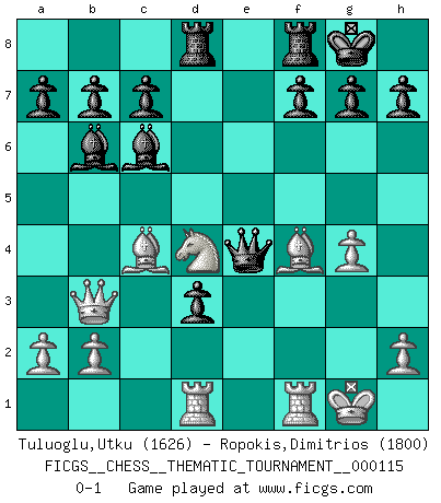 Last move : 0-1 2010 July 11 19:48:51 [Event "FICGS__CHESS__THEMATIC_TOURNAMENT__000115"] [Site "FICGS"] [Date "2010.07.08"] [Round "1"] [White "Tuluoglu,Utku"] [Black "Ropokis,Dimitrios"] [Result "0-1"] [WhiteElo "1626"] [BlackElo "1800"] 1.d4 d5 2.c4 Nc6 3.Nf3 Bg4 4.cxd5 Bxf3 5.dxc6 Bxc6 6.Nc3 e6 7.e4 Nf6 8.f3 Bb4 9.Bc4 Qe7 10.Be3 Rd8 11.O-O O-O 12.Qb3 Ba5 13.Rad1 Bb6 14.g4 e5 15.Ne2 Nxg4 16.fxg4 exd4 17.Bf4 d3 18.Nd4 Qxe4 0-1 QGD : Chigorin defense Kingside Castling by player White (move 11) Kingside Castling by player Black (move 11) Player Black won this chess game. Follow this game move after move (download)For surely of all the drugs in the world, Chess must be the most permanently pleasurable. (Assiac) Bogoljubow: Matt in vier Zügen! Tartakower: Ich verbitte mir jede Belästigung! (Savielly Grigorievitsch Tartakower) El Ajedrez es tortura mental. (Garry Kasparov) On peut tirer plus d'utilité d'une partie perdue que de 100 parties gagnées. (Capablanca) Computers have lots of memory but no imagination. (Anonymous)
