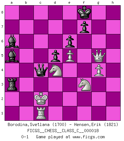 Last move : 0-1 2007 July 21 10:24:39 [Event "FICGS__CHESS__CLASS_C__000018"] [Site "FICGS"] [Date "2006.11.12"] [Round "1"] [White "Borodina,Svetlana"] [Black "Hensen,Erik"] [Result "0-1"] [WhiteElo "1700"] [BlackElo "1821"] 1.e4 c5 2.Nf3 d6 3.d4 cxd4 4.Nxd4 Nf6 5.Nc3 a6 6.Be3 e6 7.f3 b5 8.Qd2 b4 9.Nce2 d5 10.e5 Nfd7 11.f4 Bc5 12.a3 bxa3 13.b4 Be7 14.Rxa3 O-O 15.c3 Nb6 16.Ng1 Qc7 17.Ngf3 Bb7 18.Bd3 Nc4 19.Bxc4 Qxc4 20.Kf2 Nd7 21.Rb1 a5 22.Rxa5 Rxa5 23.bxa5 Nc5 24.Kg1 Ra8 25.Rb4 Qa6 26.Rb5 Bc8 27.Rb1 Bd7 28.c4 Qxc4 29.Ra1 Bd8 30.Qb2 Qa6 31.Qc2 Rc8 32.Qd1 Ne4 33.Nd2 Qd3 34.Qe1 Nc3 35.N2f3 Ra8 36.Bd2 Ne4 37.Bb4 Rb8 38.h3 h6 39.Kh2 Qa6 40.Bd2 Rc8 41.Qb1 Nxd2 42.Nxd2 Qa7 43.Qg1 h5 44.Qe3 Ra8 45.Qd3 Qc5 46.N2f3 g6 47.a6 Bc8 48.g4 hxg4 49.hxg4 Qb6 50.Rh1 Qxa6 51.Qd2 Qa2 52.Nc2 Qa5 53.Qe2 Ba6 54.Qg2 Qc5 55.Ncd4 Bd3 56.Kg3 Qf8 57.Qh2 Qg7 58.Qb2 g5 59.Qd2 gxf4+ 60.Qxf4 Ra3 61.Rc1 Ba6 62.Kf2 Qh7 63.Nc6 Qh3 64.Ncd4 Bb6 65.Qg5+ Kf8 66.Ke1 Qf1+ 67.Kd2 Ba5+ 68.Kc2 Qc4+ 0-1 Sicilian : Najdorf, Byrne (English) attack Kingside Castling by player Black (move 14) Player Black won this chess game. Follow this game move after move (download)Chess is a part of culture and if a culture is declining then Chess too will decline. (Mikhail Botvinnik) Ich habe Putins Aufstieg an die Macht beobachtet und seine Politik, die demokratischen Institutionen meines Landes zu zerstören. (Garry Kasparov) Mi estilo es algo parecido entre un poco de Tal y Petrosian. (Reshevsky) La vie est comme un jeu d'échecs : nous esquissons un plan, mais celui-ci est tributaire de ce que daignent faire l'adversaire aux échecs et le destin dans la vie. (Arthur Schopenhauer) Perhaps chess is the wrong game for the times (The Chess Master and the Computer, by Garry Kasparov - 2010)