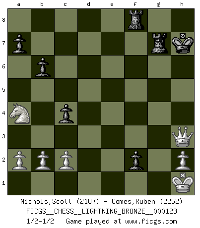 Last move : 1/2-1/2 2010 July 8 18:34:27 [Event "FICGS__CHESS__LIGHTNING_BRONZE__000123"] [Site "FICGS"] [Date "2010.07.08"] [Round "1"] [White "Nichols,Scott"] [Black "Comes,Ruben"] [Result "1/2-1/2"] [WhiteElo "2187"] [BlackElo "2252"] 1.e4 c5 2.Nc3 d6 3.f4 Nc6 4.Nf3 g6 5.Bc4 Bg7 6.O-O e6 7.d3 Nge7 8.Qe1 O-O 9.f5 gxf5 10.Qg3 fxe4 11.dxe4 Ng6 12.Be3 Nd4 13.Rad1 Qb6 14.Ng5 Ne5 15.Bb3 Bd7 16.Qh3 h6 17.Nf3 Ndxf3+ 18.gxf3 Kh7 19.Kh1 Ng6 20.Rg1 Qc7 21.Qh5 c4 22.Ba4 Bxa4 23.Nxa4 Rad8 24.Rg5 d5 25.Rdg1 b6 26.Rxg6 fxg6 27.Qxg6+ Kh8 28.Bxh6 Bxh6 29.Qxh6+ Qh7 30.Qg5 Rd7 31.Qe5+ Rg7 32.Rg5 dxe4 33.Rh5 exf3 34.Rxh7+ Kxh7 35.Qxe6 f2 36.Qh3+ Kg8 37.Qe6+ Kh7 38.Qh3+ Kg8 39.Qe6+ Kh7 40.Qh3+ 1/2-1/2 Sicilian : Closed Kingside Castling by player White (move 6) Kingside Castling by player Black (move 8) This chess game ended in a draw. Follow this game move after move (download)Chess demands total concentration. (Bobby Fischer) Ich verachte die Medien. (Robert James Fischer) En manos de Fischer's, una diminuta ventaja teórica es tan buena como tener una Reina de ventaja. (Isaac Kashdan) Toutes les manuvres exécutées sur une colonne ouverte ont pour but ultime l'intrusion définitive sur la septième ou la huitième rangée, en plein cur de la position ennemie. (Aaron Nimzovitch) You can't play chess if you're groggy from pills. (Anatoly Karpov)