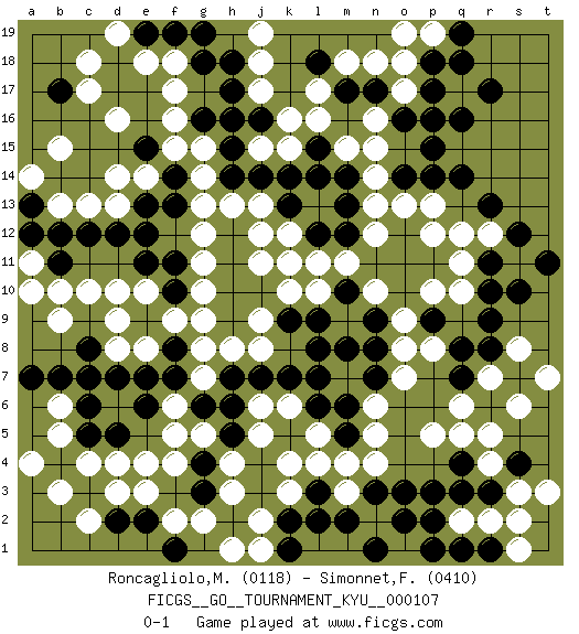 Last move : 0-1 2011 January 1 11:6:34 [Event "FICGS__GO__TOURNAMENT_KYU__000107"] [Site "FICGS"] [Date "2010.07.09"] [Round "1"] [Black "Roncagliolo,Marco"] [White "Simonnet,Franck"] [Result "0-1"] [Rating 1 "0118"] [Rating 2 "0410"] 1.r17 d4 2.r3 d16 3.s10 q10 4.o10 q12 5.r11 q5 6.r9 r7 7.q8 q6 8.p9 q11 9.p11 r12 10.s12 s8 11.r13 p12 12.o12 p13 13.p14 o13 14.o14 n13 15.n11 m11 16.m10 n12 17.o11 o9 18.n9 o8 19.n8 o7 20.m12 l11 21.m13 n14 22.k11 l10 23.l9 k10 24.l12 k12 25.j10 j11 26.k9 k11 27.m14 n15 28.p16 o17 29.o16 n16 30.p17 o18 31.p18 p19 32.q19 o19 33.q18 f17 34.k13 j13 35.k14 k16 36.l14 j15 37.j14 h13 38.h11 j12 39.h14 g13 40.f13 g14 41.h15 g15 42.j16 k15 43.h16 j17 44.l15 l16 45.g16 f16 46.h17 j18 47.h18 j19 48.g18 f18 49.f19 e18 50.n17 n18 51.m17 m18 52.h12 d10 53.f11 f9 54.e12 g11 55.h10 g12 56.l18 l17 57.p15 k4 58.l8 k6 59.l7 l5 60.k7 j6 61.m6 n5 62.n7 n6 63.m8 j9 64.h9 j8 65.j7 h8 66.h7 g8 67.f8 g7 68.h6 h4 69.g6 f4 70.f7 g9 71.e9 e10 72.p3 p10 73.m5 m4 74.l6 n4 75.o3 t3 76.q3 s2 77.o2 f6 78.e6 f5 79.d7 e8 80.e7 d8 81.c12 d13 82.d12 c13 83.e13 e14 84.e11 b13 85.b12 c10 86.c8 d9 87.c7 b10 88.a13 a14 89.a12 b15 90.b17 c17 91.n3 m3 92.m2 r2 93.n1 q2 94.l3 k3 95.k2 j2 96.k1 j1 97.l2 l4 98.p1 s3 99.q1 r4 100.q4 p5 101.r1 s1 102.s4 r5 103.s7 s6 104.p2 b5 105.c5 c4 106.d2 c2 107.d5 e4 108.h5 j5 109.e2 f2 110.q14 a11 111.f14 e3 112.c6 b6 113.b7 b9 114.f10 g10 115.f1 g2 116.r10 n10 117.g4 g5 118.r8 t7 119.t11 p8 120.e19 d19 121.g19 c18 122.q16 m15 123.c3 d3 124.e15 d14 125.q7 f15 126.g3 h3 127.h2 h1 128.b4 b3 129.b11 a10 130.a7 a4 0-1 This go game has been lost on time (started : 2010.07.09 4:30:19) Here are the names of the openings (joseki) played in the four corners : Corner q16 : r17 q12 San-San (Sam-Sam, San-San) 3-3 Point. The San-San (3-3) point, emphasizing territory at the expense of influence. Corner q4 : r3 q5 San-San (Sam-Sam, San-San) 3-3 Point. The San-San (3-3) point, emphasizing territory at the expense of influence. Ikken Takagakari (Hankan Nop'dakeolch'im, Yi Gaokeolch'im, 1-Space High Approach). White 2 is a high tight attack with a direction bias. White continues with 4-5. Tactically, any other response is less advantageous. Player White won this Go (weiqi, baduk) game. Follow this game move after move (download)Take the cutting stone on the second line. (Anonymous) Perhaps chess is the wrong game for the times (The Chess Master and the Computer, by Garry Kasparov - 2010)