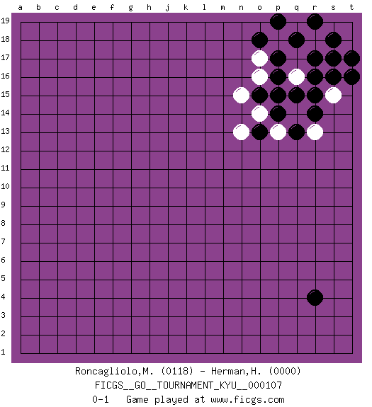Last move : 0-1 2010 October 15 21:51:43 [Event "FICGS__GO__TOURNAMENT_KYU__000107"] [Site "FICGS"] [Date "2010.07.09"] [Round "1"] [Black "Roncagliolo,Marco"] [White "Herman,Herdiansyah"] [Result "0-1"] [Rating 1 "0118"] [Rating 2 "0000"] 1.r17 t17 2.r4 t19 3.s16 q16 4.s18 t18 5.t16 s19 6.r19 p15 7.s17 t19 8.r15 t18 9.q18 s19 10.p17 q19 11.t17 q17 12.p19 p13 13.q15 q14 14.p16 p18 15.o18 s15 16.r16 q16 17.r14 o14 18.o15 n15 19.p14 o16 20.p15 o17 21.q13 r13 22.o13 n13 0-1 This go game has been lost on time (started : 2010.07.09 4:30:19) Here are the names of the openings (joseki) played in the four corners : Corner q16 : r17 t17 San-San (Sam-Sam, San-San) 3-3 Point. The San-San (3-3) point, emphasizing territory at the expense of influence. Player White won this Go (weiqi, baduk) game. Follow this game move after move (download)The comb formation is alive. (Anonymous) Programming can only do so much before it becomes too much. (Don Groves)