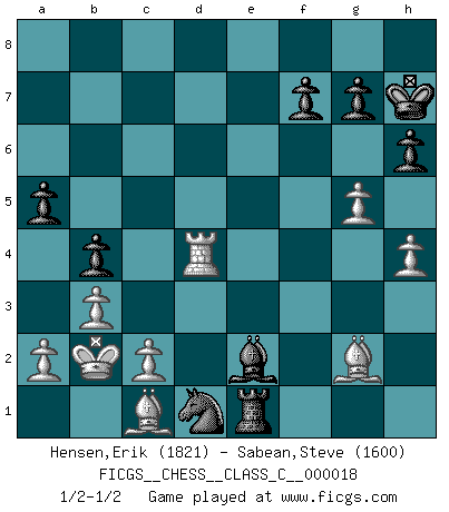 Last move : 1/2-1/2 2007 January 14 16:50:13 [Event "FICGS__CHESS__CLASS_C__000018"] [Site "FICGS"] [Date "2006.11.12"] [Round "1"] [White "Hensen,Erik"] [Black "Sabean,Steve"] [Result "1/2-1/2"] [WhiteElo "1821"] [BlackElo "1600"] 1.e4 c5 2.Nf3 d6 3.d4 cxd4 4.Nxd4 Nf6 5.Nc3 Nc6 6.Bg5 e6 7.Qd2 a6 8.O-O-O h6 9.Be3 Be7 10.f4 O-O 11.Be2 Qc7 12.g4 Nxd4 13.Qxd4 e5 14.Qd3 d5 15.exd5 exf4 16.Bd4 Re8 17.Rhg1 Nh7 18.Rgf1 Bd6 19.Kb1 b5 20.Ne4 Bb7 21.Bf3 Rad8 22.Nxd6 Qxd6 23.h4 Bxd5 24.Bc3 Bc4 25.Qxd6 Rxd6 26.Rxd6 Bxf1 27.Bc6 Rc8 28.Bb7 Re8 29.Bd2 Nf6 30.Bxf4 Re1+ 31.Bc1 Ne4 32.Rd8+ Kh7 33.b3 Nc3+ 34.Kb2 b4 35.Bf3 Bb5 36.Rd4 a5 37.g5 Be2 38.Bg2 Nd1+ 1/2-1/2 Sicilian : Richter-Rauzer, Rauzer attack, 7...a6 Queenside Castling by player White (move 8) Kingside Castling by player Black (move 10) This chess game ended in a draw. Follow this game move after move (download)I thought the most common mistake [in chess] was the first one: Learning the game :P (Garvin Gray, FICGS forum) Ein typischer, sehr verbreiteter Gedankenschädling ist der, daß der betreffende Amateur von der Annanhme ausgeht, daß jeder einzelne Zug etwas zu leisten habe. (Aaron Nimzowitsch) El Ajedrez no es una pizca de inferior al violín, y tenemos un gran número de violinistas profesionales. (Mikhail Botvinnik) La menace est plus forte que l'exécution. (Aaron Nimzovitch) There is a computer disease that anybody who works with computers knows about. It's a very serious disease and it interferes completely with the work. The trouble with computers is that you 'play' with them ! (Richard P. Feynman)