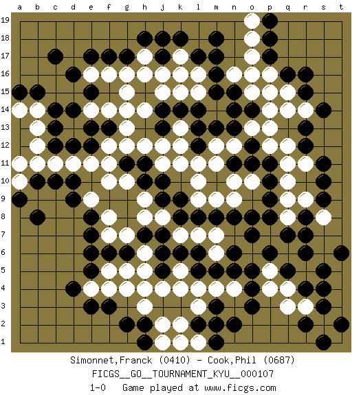 Last move : 1-0 2010 October 9 22:46:26 [Event "FICGS__GO__TOURNAMENT_KYU__000107"] [Site "FICGS"] [Date "2010.07.09"] [Round "1"] [Black "Simonnet,Franck"] [White "Cook,Phil"] [Result "1-0"] [Rating 1 "0410"] [Rating 2 "0687"] 1.d4 q4 2.d16 p16 3.r6 q6 4.q7 f4 5.e5 h4 6.p6 q9 7.q16 q15 8.r16 h16 9.q5 d13 10.e15 g13 11.p17 o16 12.c14 g7 13.d10 f10 14.e8 f8 15.e13 f14 16.e12 e14 17.d14 e9 18.d9 f12 19.p9 q11 20.e7 g5 21.f13 e11 22.d12 d11 23.c12 g14 24.f3 g4 25.o4 g12 26.o11 p12 27.s14 q14 28.n13 o13 29.o12 p13 30.n15 n16 31.m16 p15 32.o14 m4 33.m5 l4 34.h2 k2 35.n2 m7 36.n6 m6 37.n5 n9 38.m10 n10 39.n11 o10 40.p10 q10 41.m8 m9 42.l8 l9 43.k8 l10 44.n8 m11 45.p11 q12 46.k6 k4 47.l5 k5 48.j6 j4 49.l13 m12 50.m13 k11 51.j9 j11 52.h10 h12 53.f17 g15 54.h18 n12 55.o8 q8 56.p8 o17 57.p18 h8 58.g11 f11 59.k16 k13 60.k14 h9 61.j10 j15 62.j13 k12 63.l12 l11 64.j14 k15 65.l14 l15 66.m15 l16 67.m17 o18 68.p19 o19 69.l17 k17 70.k18 j16 71.s10 n4 72.g6 h6 73.f6 f7 74.j17 h17 75.j18 k16 76.r12 e4 77.e3 f5 78.e6 h5 79.g17 g16 80.c17 j8 81.k9 g10 82.h11 j12 83.r8 c11 84.c10 b11 85.b10 b12 86.c13 r11 87.s11 f16 88.e17 e16 89.r13 p4 90.o3 k7 91.l6 l7 92.j7 r5 93.r4 r14 94.r15 p5 95.s5 r3 96.s3 s2 97.r2 q3 98.s1 o6 99.o5 p7 100.o7 b13 101.b15 a10 102.a9 a11 103.b8 a14 104.a15 b14 105.h7 j2 106.g2 h3 107.m3 l3 108.l2 l1 109.m2 o15 110.h1 j1 111.m1 k1 112.j5 p14 113.n14 h14 114.m18 t3 115.t2 t4 116.s4 t5 117.t6 r9 118.s9 s8 119.r7 1-0 Here are the names of the openings (joseki) played in the four corners : Corner q4 : q4 r6 Hoshi (Hwajeom, Seongjeom, Xingwei`) 4-4 Point. The star or hoshi (4-4) point, emphasizing influence at the potential expense of territory. Ikken Kakari (Hankan Keolch'im, Yi Gua`jiao~, 1-Space Low Approach). Black 2 is the standard approach move to the 4-4. Corner d4 : d4 f4 Hoshi (Hwajeom, Seongjeom, Xingwei`) 4-4 Point. The star or hoshi (4-4) point, emphasizing influence at the potential expense of territory. Ikken Takagakari (Hankan Nop'dakeolch'im, Yi Gaojia, 1-Space High Approach). Black typically responds at 6-4 or 3-10. Black 4-10 is played when Black finds play on the right side advantageous. Black 4-8 or 3-8 may be played when Black has support at top. Corner q16 : p16 q16 Takamoku (Gomok, Gaomu`) 5-4 Point. The takamoku (high) point (5-4). With its emphasis on influence, the 5-4 point complements the 4-4 (hoshi) point in creating an influence-oriented fuseki. Corner d16 : d16 h16 Hoshi (Hwajeom, Seongjeom, Xingwei`) 4-4 Point. The star or hoshi (4-4) point, emphasizing influence at the potential expense of territory. Player Black won this Go (weiqi, baduk) game. Follow this game move after move (download)If your stone is capped, play the knight's move. (Anonymous) The smarter you play, the luckier you'll be. (Mark Pilarski)