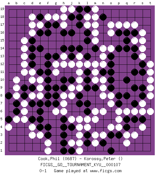 Last move : 0-1 2010 October 9 20:14:56 [Event "FICGS__GO__TOURNAMENT_KYU__000107"] [Site "FICGS"] [Date "2010.07.09"] [Round "1"] [Black "Cook,Phil"] [White "Korossy,Peter"] [Result "0-1"] [Rating 1 "0687"] 1.q4 d4 2.q16 d16 3.j16 r6 4.j4 o4 5.f4 l4 6.f16 c14 7.q8 p6 8.d7 c6 9.e6 c7 10.d9 k10 11.k8 j8 12.k7 h8 13.f8 j5 14.h4 k5 15.l7 h6 16.e5 o8 17.q10 r3 18.r9 o17 19.o10 n9 20.k12 l17 21.l16 m16 22.l15 o14 23.q14 r17 24.o13 n13 25.o12 n12 26.o11 h13 27.f13 j12 28.n11 m11 29.m14 n14 30.l10 m10 31.l11 l12 32.l13 m12 33.j13 k11 34.l9 k13 35.j14 h12 36.p7 o7 37.o6 n6 38.o5 p5 39.n5 m6 40.n4 p4 41.q5 q6 42.p8 q17 43.o9 n8 44.h10 j9 45.h9 c11 46.d13 c13 47.d12 d11 48.f11 b9 49.c9 b10 50.k14 k12 51.l6 l5 52.m9 n10 53.h14 r15 54.q15 s14 55.r13 s13 56.r11 t10 57.s12 t12 58.s11 t11 59.s8 e3 60.e4 d3 61.f3 e17 62.k17 m17 63.g7 h7 64.g13 g18 65.f17 f18 66.g17 h18 67.k18 l18 68.e16 d17 69.r16 s16 70.p16 o16 71.p14 m15 72.e14 e10 73.f10 e9 74.f9 e8 75.e7 d8 76.e11 s7 77.c8 d10 78.r14 s15 79.t7 t6 80.r7 t8 81.r5 q3 82.s5 s6 83.s9 t9 84.d15 c15 85.d14 c12 86.j10 k9 87.g8 p17 88.h5 g6 89.f7 h17 90.h16 k3 91.h3 j2 92.h2 f2 93.d5 c5 94.o3 m5 95.p3 s4 96.j1 k1 97.h1 f1 98.l19 m19 99.k19 j19 100.l2 k2 101.j18 h19 102.n18 m18 103.e18 d18 104.b7 b8 105.b6 b5 106.a8 g12 107.f12 g11 108.g9 k4 109.m4 m2 110.n2 m3 111.l3 n3 112.o1 q2 113.a5 a4 0-1 Here are the names of the openings (joseki) played in the four corners : Corner d16 : d16 j16 Hoshi (Hwajeom, Seongjeom, Xingwei`) 4-4 Point. The star or hoshi (4-4) point, emphasizing influence at the potential expense of territory. Corner q4 : q4 r6 Hoshi (Hwajeom, Seongjeom, Xingwei`) 4-4 Point. The star or hoshi (4-4) point, emphasizing influence at the potential expense of territory. Ikken Kakari (Hankan Keolch'im, Yi Gua`jiao~, 1-Space Low Approach). White 2 is the standard approach move to the 4-4. Corner d4 : d4 j4 Hoshi (Hwajeom, Seongjeom, Xingwei`) 4-4 Point. The star or hoshi (4-4) point, emphasizing influence at the potential expense of territory. Corner q16 : q16 o17 Hoshi (Hwajeom, Seongjeom, Xingwei`) 4-4 Point. The star or hoshi (4-4) point, emphasizing influence at the potential expense of territory. Ikken Kakari (Hankan Keolch'im, Yi Gua`jiao~, 1-Space Low Approach). White 2 is the standard approach move to the 4-4. Player White won this Go (weiqi, baduk) game. Follow this game move after move (download)Be a little patient. Keshi works ! (Anonymous) Difficult things take a long time, impossible things a little longer. (Author unknown)