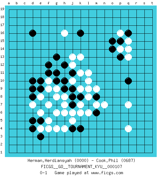 Last move : 0-1 2010 October 10 21:40:38 [Event "FICGS__GO__TOURNAMENT_KYU__000107"] [Site "FICGS"] [Date "2010.07.09"] [Round "1"] [Black "Herman,Herdiansyah"] [White "Cook,Phil"] [Result "0-1"] [Rating 1 "0000"] [Rating 2 "0687"] 1.d4 q4 2.d10 q15 3.d16 h16 4.k4 k6 5.q10 f10 6.k10 l11 7.k16 k13 8.q16 p16 9.d9 h4 10.e10 q7 11.h10 g9 12.g10 f9 13.f11 l10 14.h9 l8 15.f8 g8 16.g7 h8 17.j7 h7 18.j8 h6 19.j9 j6 20.e9 g6 21.h5 f7 22.e7 e8 23.f6 e6 24.e5 f5 25.d8 d7 26.j11 j13 27.l9 m9 28.m8 k9 29.k8 l9 30.j4 e4 31.d5 j5 32.g5 g4 33.p15 p14 34.o15 k11 35.l7 l6 36.m6 n7 37.e3 f4 38.o14 q13 39.p13 q14 40.h12 j10 41.g11 m7 42.f12 k7 43.g13 j12 0-1 This go game has been lost on time (started : 2010.07.09 4:30:19) Here are the names of the openings (joseki) played in the four corners : Corner d16 : d16 h16 Hoshi (Hwajeom, Seongjeom, Xingwei`) 4-4 Point. The star or hoshi (4-4) point, emphasizing influence at the potential expense of territory. Player White won this Go (weiqi, baduk) game. Follow this game move after move (download)When in doubt, remove the enemy stones from the board. (Bill Taylor) The project of the man are lower than those of the sky. (Chinese proverb)
