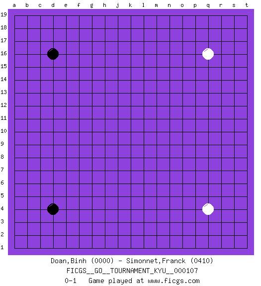 Last move : 0-1 2010 July 18 2:37:57 [Event "FICGS__GO__TOURNAMENT_KYU__000107"] [Site "FICGS"] [Date "2010.07.09"] [Round "1"] [Black "Doan,Binh"] [White "Simonnet,Franck"] [Result "0-1"] [Rating 1 "0000"] [Rating 2 "0410"] 1.d16 q4 2.d4 q16 0-1 Here are the names of the openings (joseki) played in the four corners : Corner q4 : q4 0-1 Hoshi (Hwajeom, Seongjeom, Xingwei`) 4-4 Point. The star or hoshi (4-4) point, emphasizing influence at the potential expense of territory. Player White won this Go (weiqi, baduk) game. Follow this game move after move (download)You don't have to be really good anymore to get good results. What's happening with chess is that it's gradually losing its place as the par excellence of intellectual activity. Smart people in search of a challenging board game might try a game called Go. (Hans Berliner, The New York Times, 2003) Locking firmely the window serves nothing, only small thiefs pass through there, the big thiefs enter through the front door. (Luc-Olivier Leclerc)